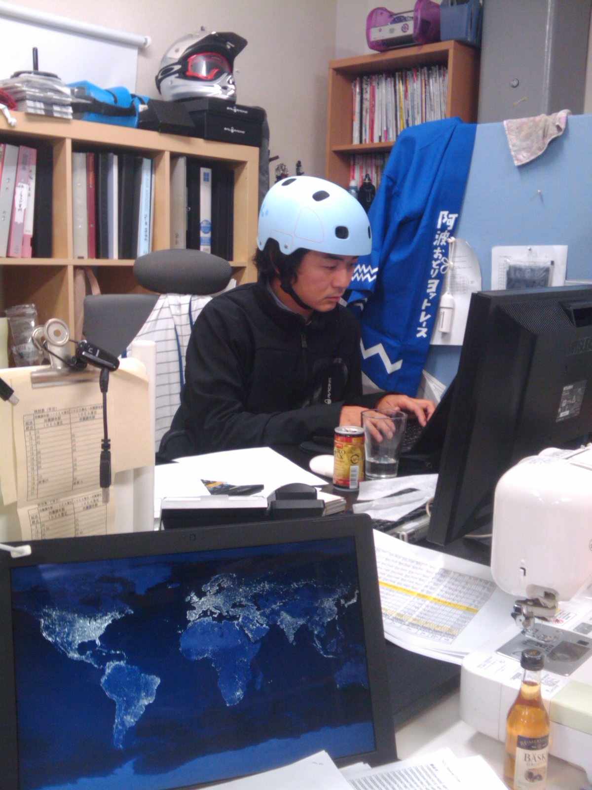 向かいに座っている保坂さん。デスクワークの時もヘルメットをしています。きっといろんなものから身を護りたいんでしょう。