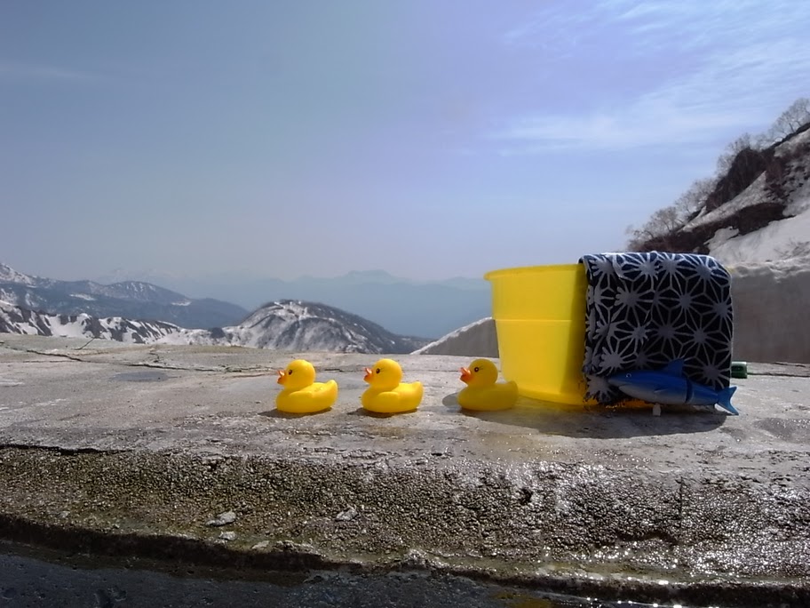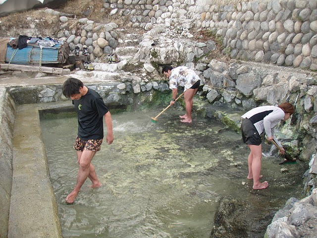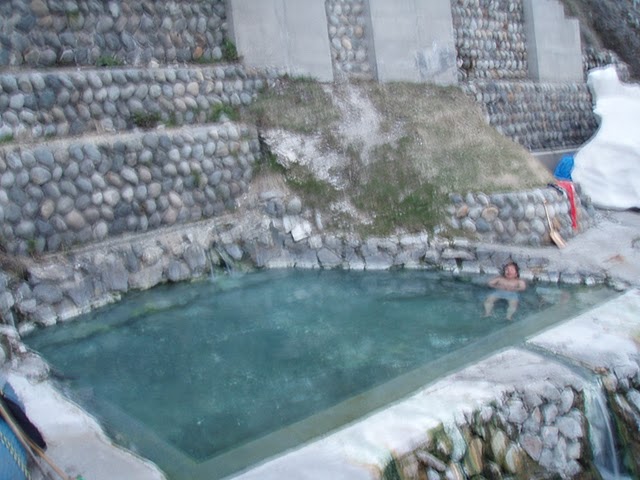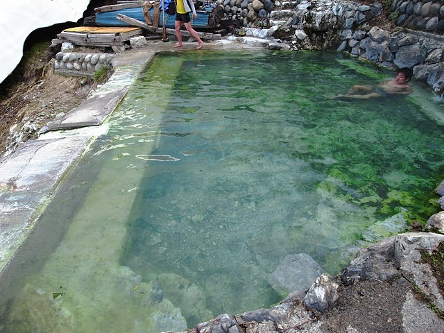 山小屋はまだあいておらず天然の温泉が野ざらしになってて