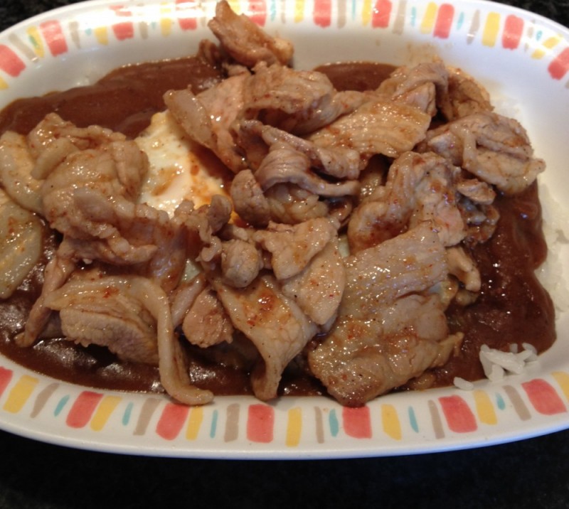 “バーグ” カレーの上に生姜焼きと卵が乗ってます。 卵は 生 or 焼き か選べますので、お好みで。 かなりボリュームがあるので、 お腹がペコペコの時に行ってみて下さい。
