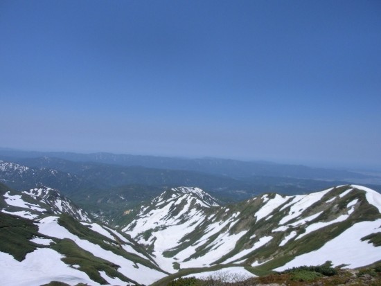 晴天の微風で汗がだくだくになりながらも、朝日連峰を眺めながら気持ち良く牛首まであっという間に着いた!湯殿山と鳥海をバックに記念撮影。今回のメンバーもみんな気が合い、最高の景色に囲まれて幸せな時間を共有した。