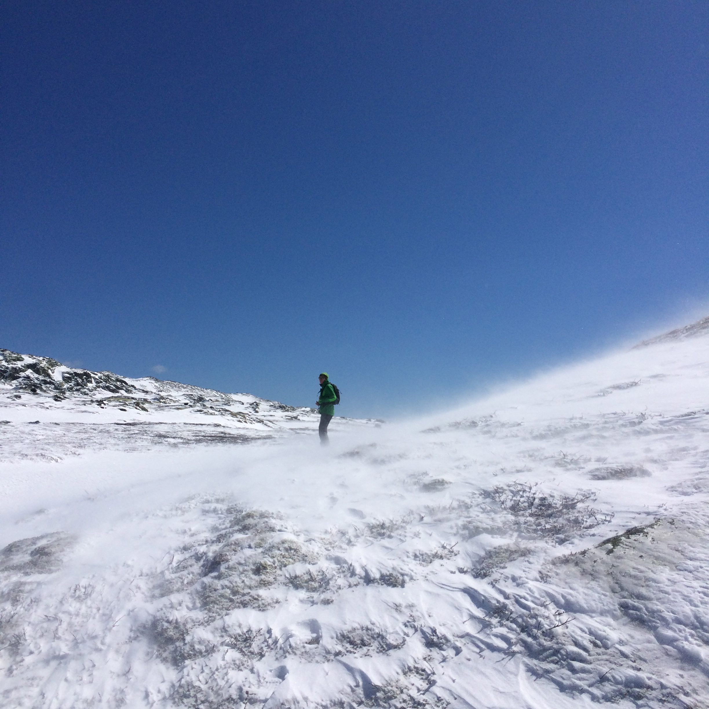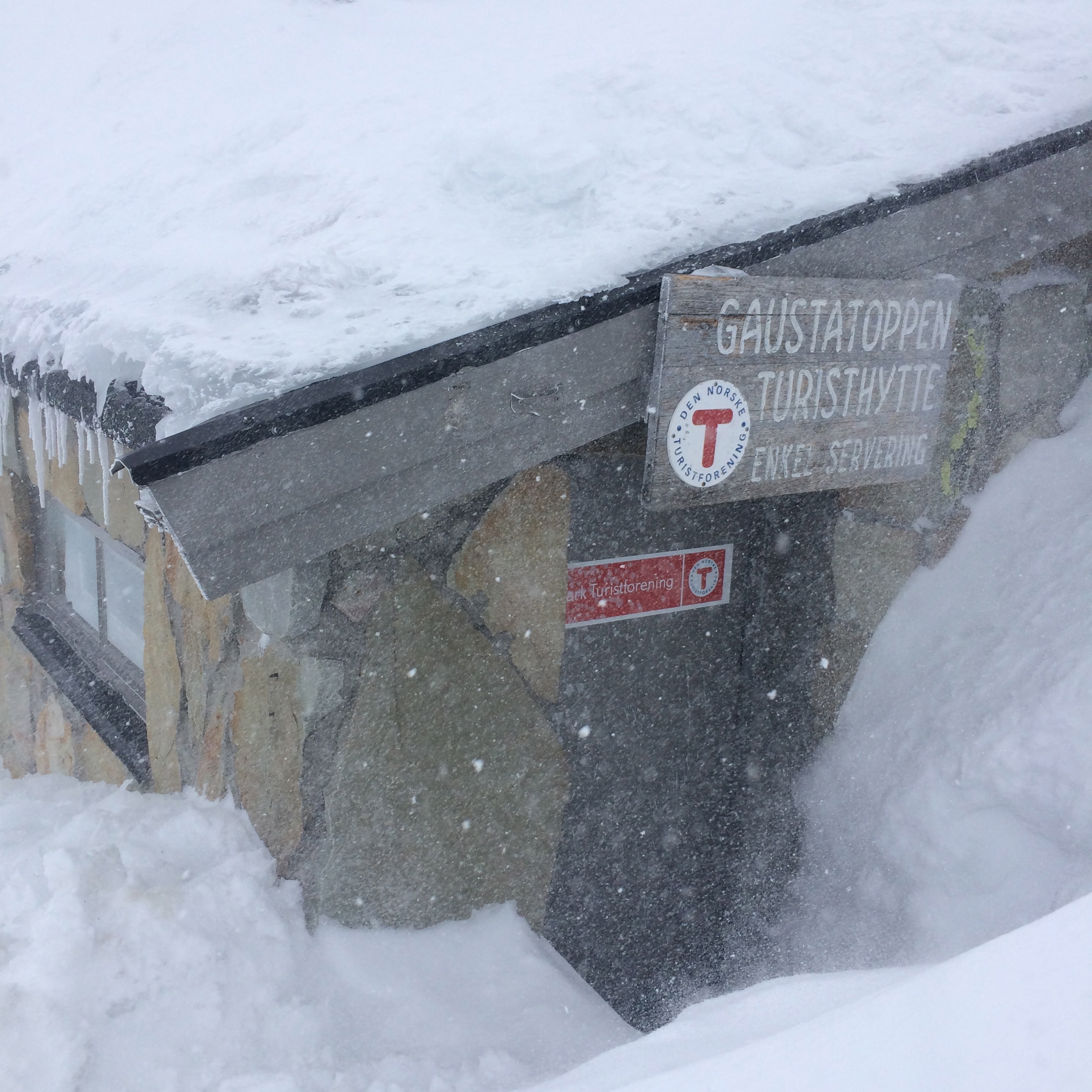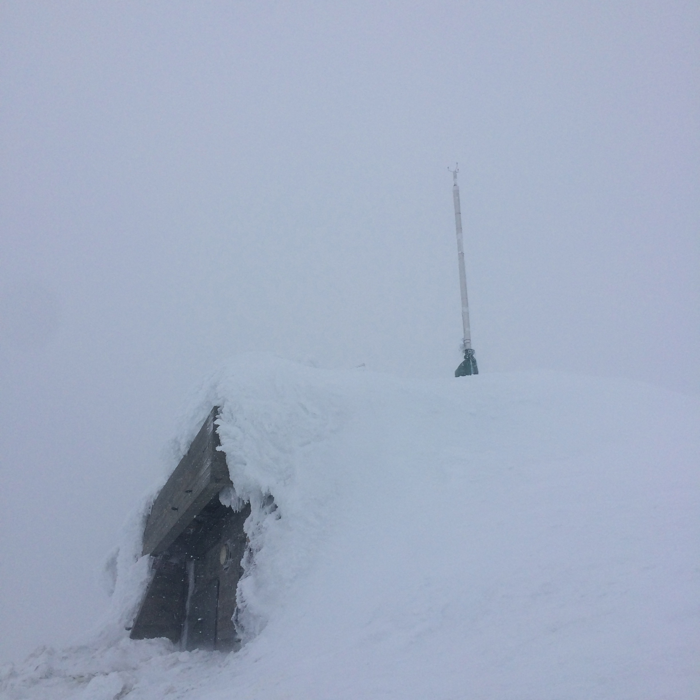 標高は1883mとそれほどではないものの、北欧の2000mは完全にホントのヤマ世界でした。晴れていればなんでもない観光登山なんでしょうが、登りはじめの粉雪天気が途中で衝撃の急変。吹雪っていうか、嵐っていうか、ものの十分でホワイトアウト。頂上はなかなかの突風でマイナス14度でした。これが頂上なんだけど、なにがなんだか分からん。