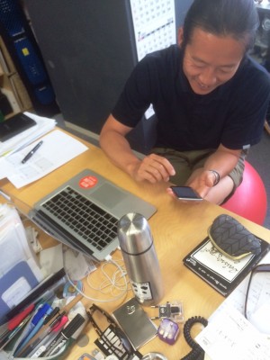 写真は今日、携帯をブラックベリーからiphone6に替えたばかりの若さんです。初期設定に少々てこずっているようです。