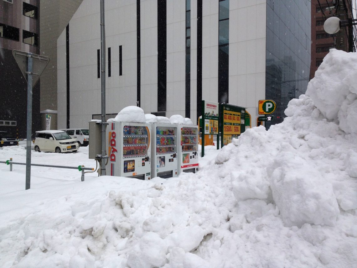 12月は記録的な大雪と報道されていましたが、長年札幌に住んでいたのでこちらに来るまでは、また大げさな報道して~なんて思っていましたが、あらビックリ!確かに雪が多いですね~自動販売機も雪山の陰に隠れこれで売れるのか~??と考えてみたり、歩道には滑り止めの砂が置いてあったりと、少し懐かい感じがしました。