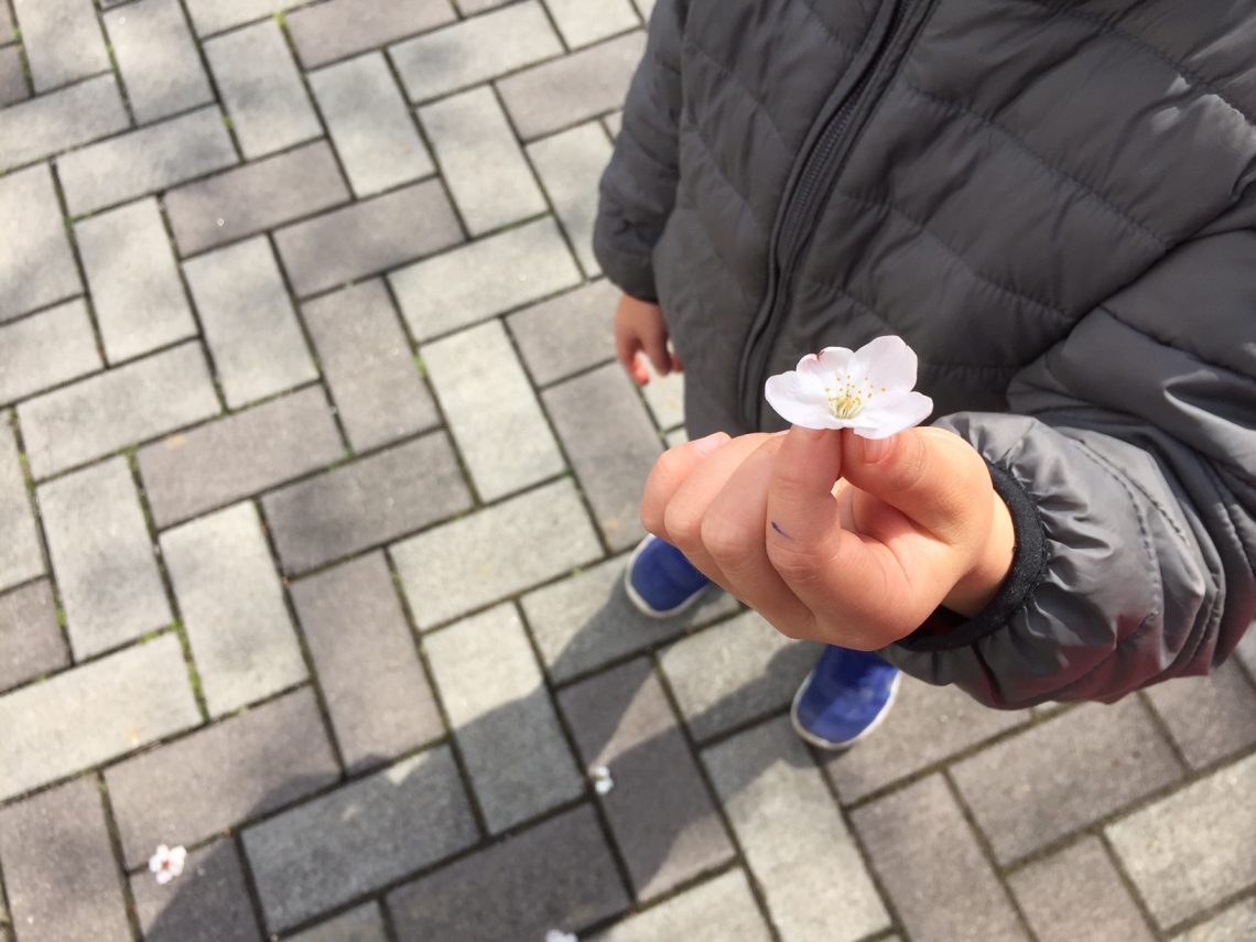 強風にあおられて落ちてしまった桜を拾うのが子供の楽しみで、 持ち帰ってお花見をするのが我が家流です。