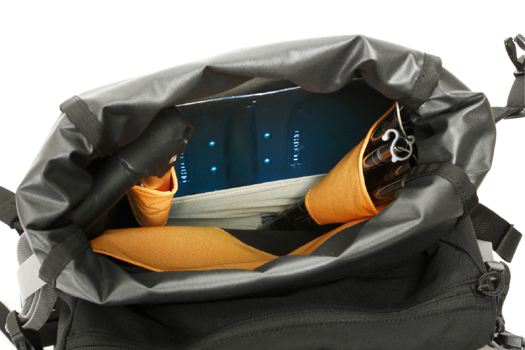 このザックの特徴はなんといっても、大きく口が開くロールトップ のギアラック。このロールトップ機能によって、いかなる時も板を装着したままストレスなくスノーセーフティギア(ショベル、スノーシュー、プローブなど)を取り出すことができます。