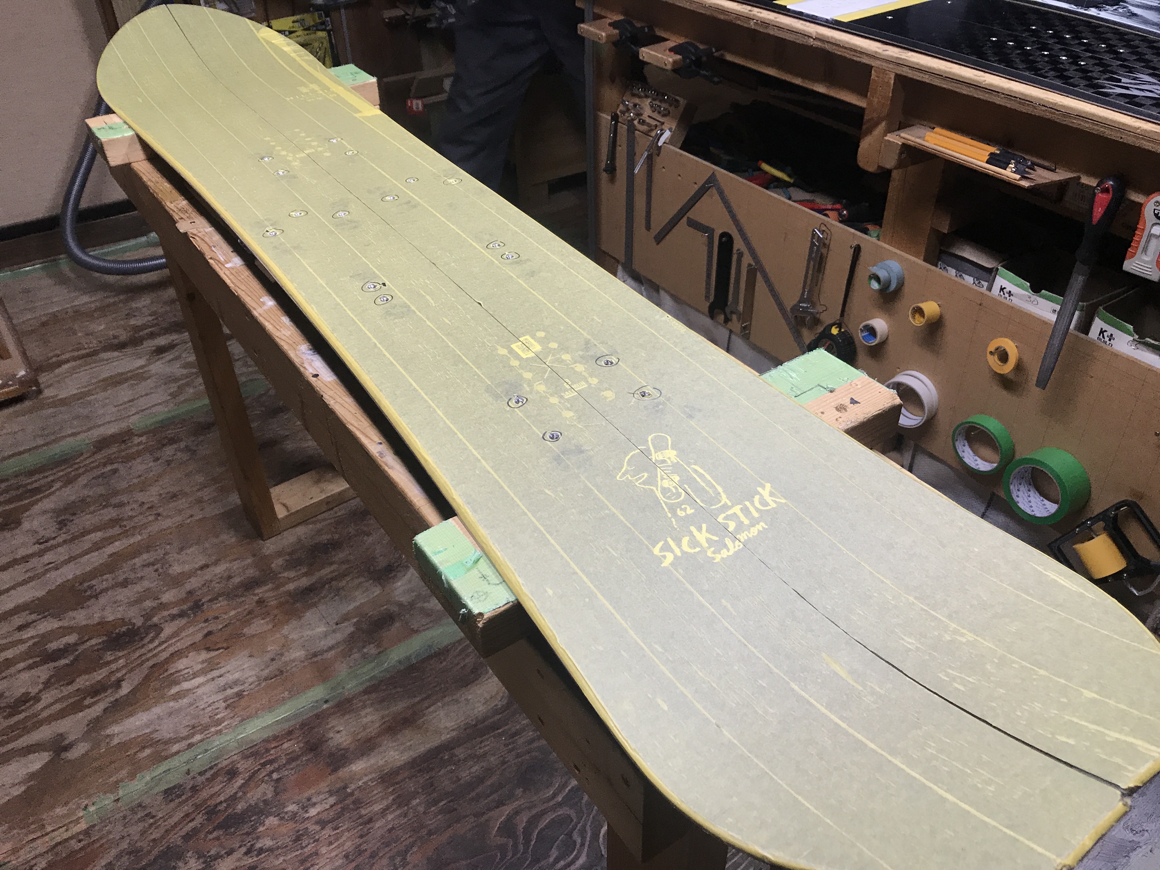 白馬番屋クラフトにて加工中〜SALOMON Snowboards BOARD SICKSTICK162,〜今も雪が降るのを楽しみに待っています。