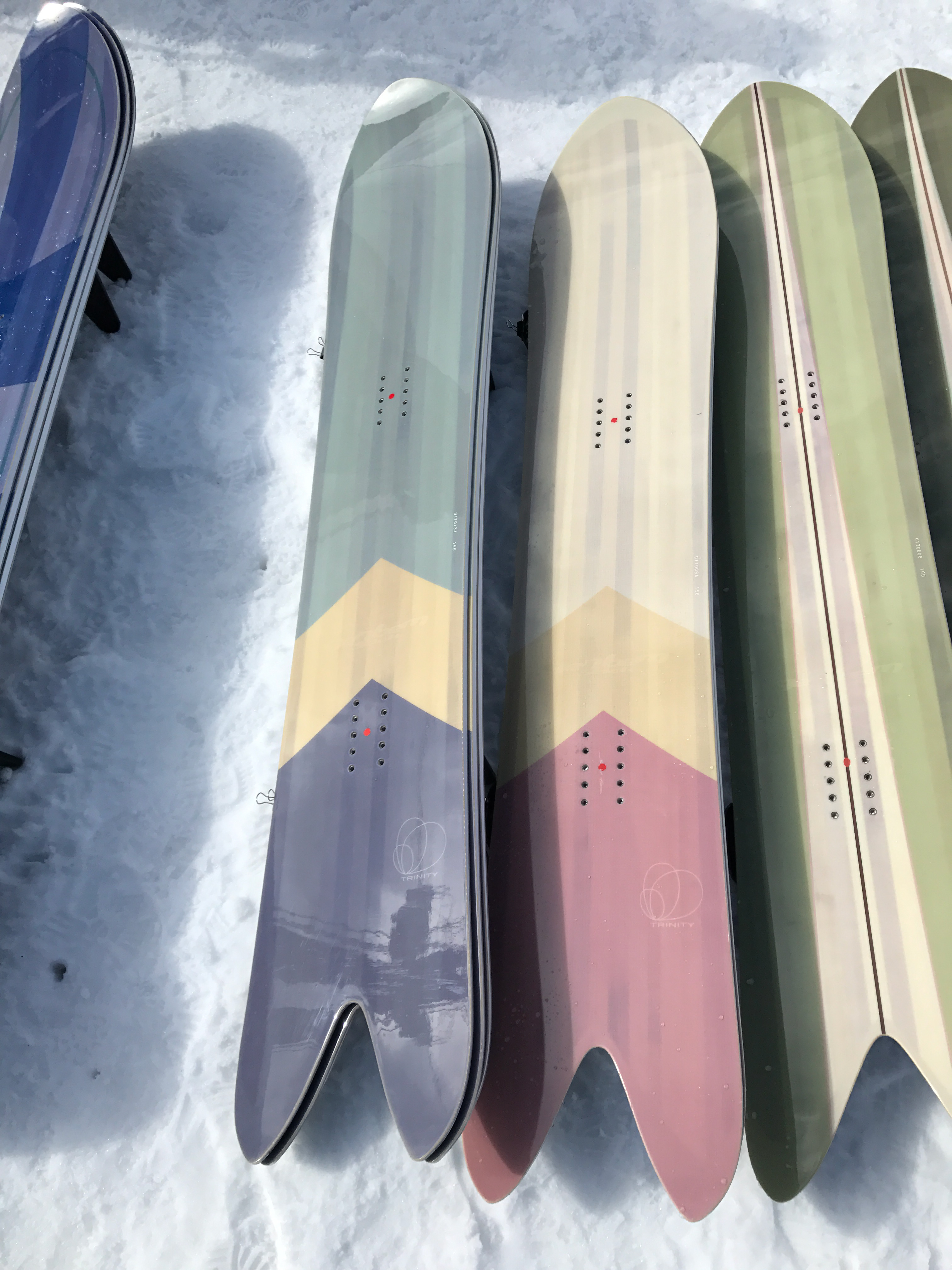 テールが割れてる形状のボードで女性の為に作られたボードは、日本だけではなく世界中を探してもあまりない貴重なボードだと思います。今シーズンで8シーズン目になり、たくさんのユーザーさんの声から少しやわらかいフレックスのTRINITYも誕生。脚力に自信がない方でも取り回しが簡単なソフトフレックスは、ゲレンデメインの方にも是非試してほしい一本です。