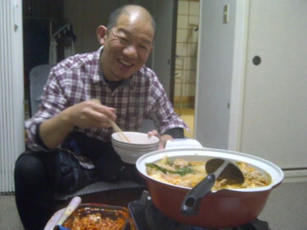 夜はオヤジふたりで「豚キムチ鍋」。この写真の大和田さん、あの芸人さんにそっくりじゃないですか?