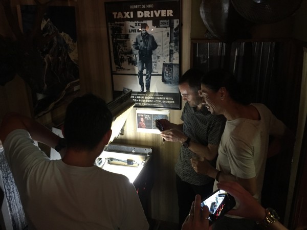 数軒回った最後がいつものココで。ジュークボックスに興味津々な二人。