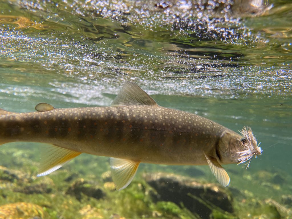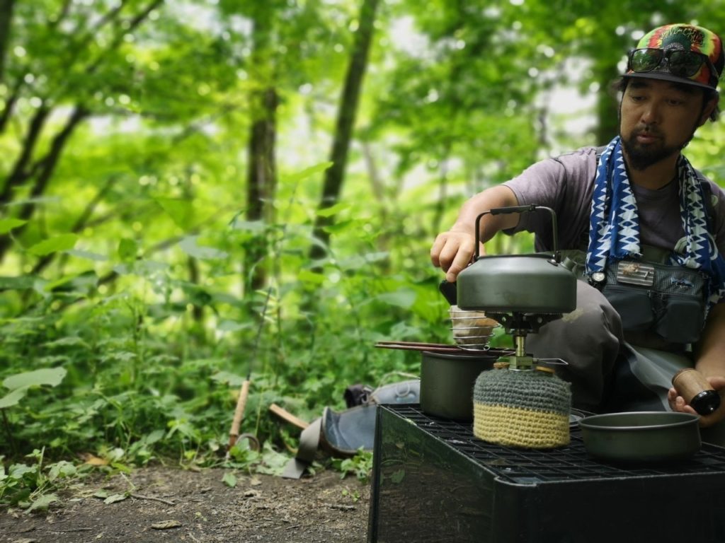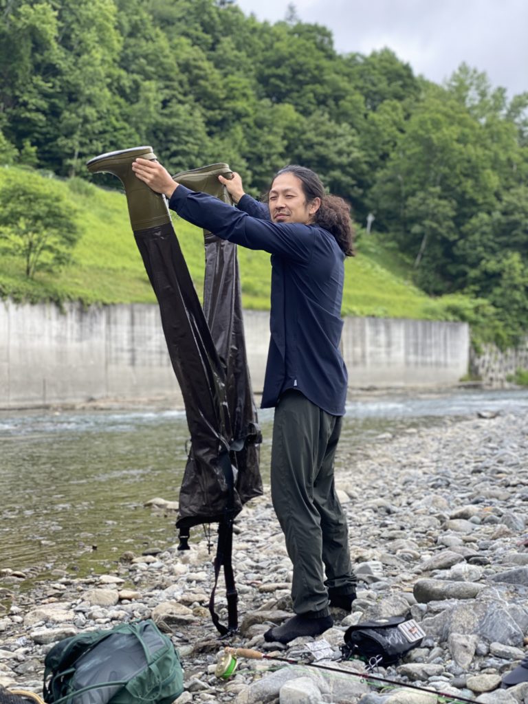 川を腰まで…胸まで浸かったり岩にしがみついたりしながら1日16キロ程川を移動し釣り歩きます。川によってですが、異常に藻やコケで滑りやすく転ぶこともあり