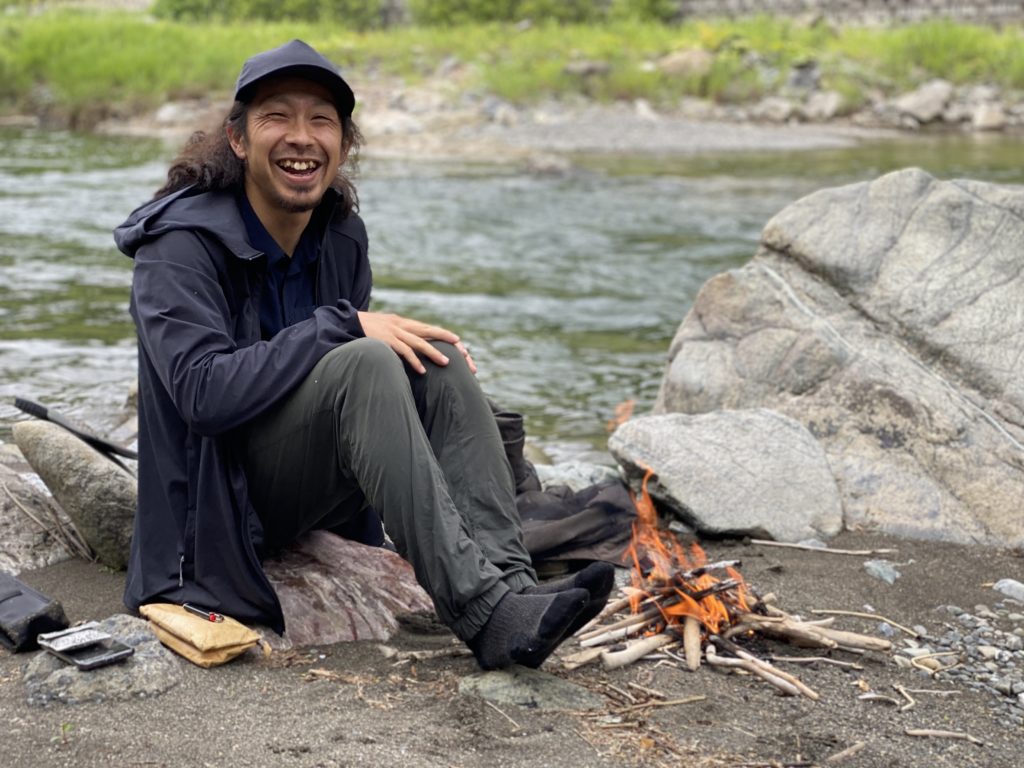 (写真:手慣れた感じにササっと流木を集め暖を取るぎゃ店長)