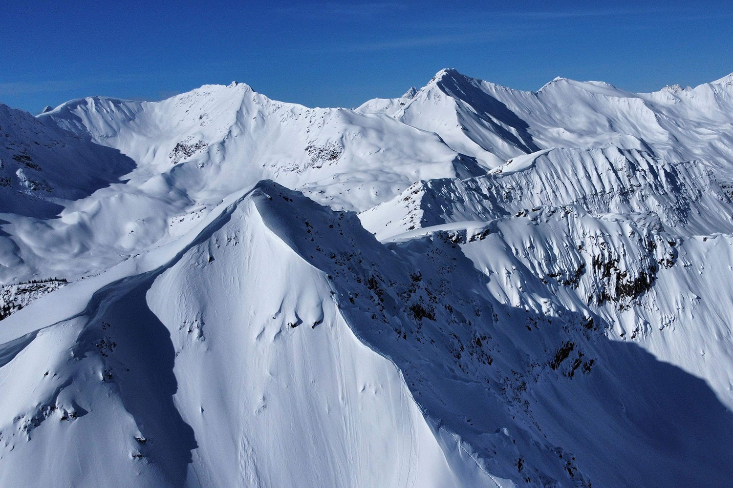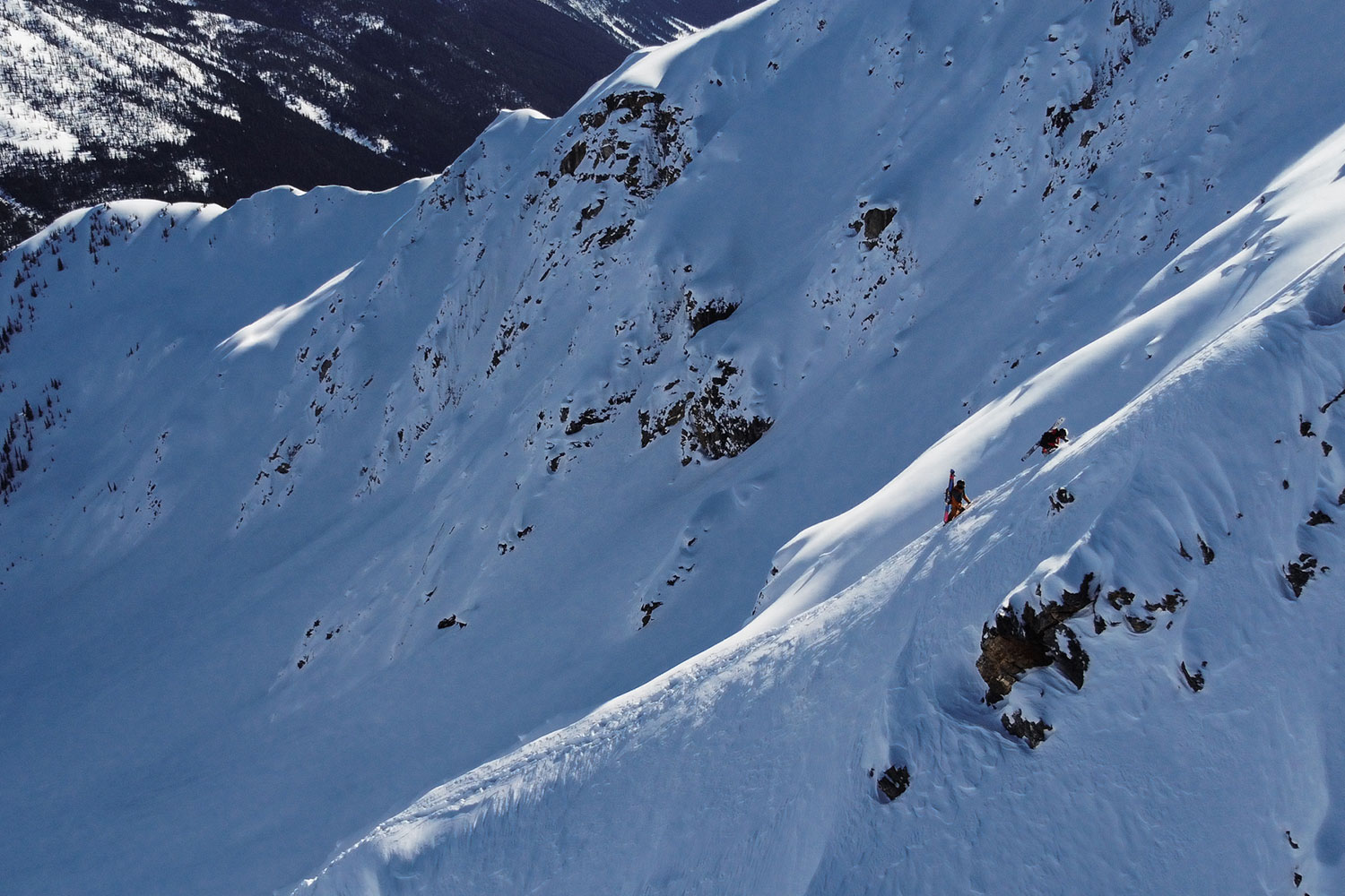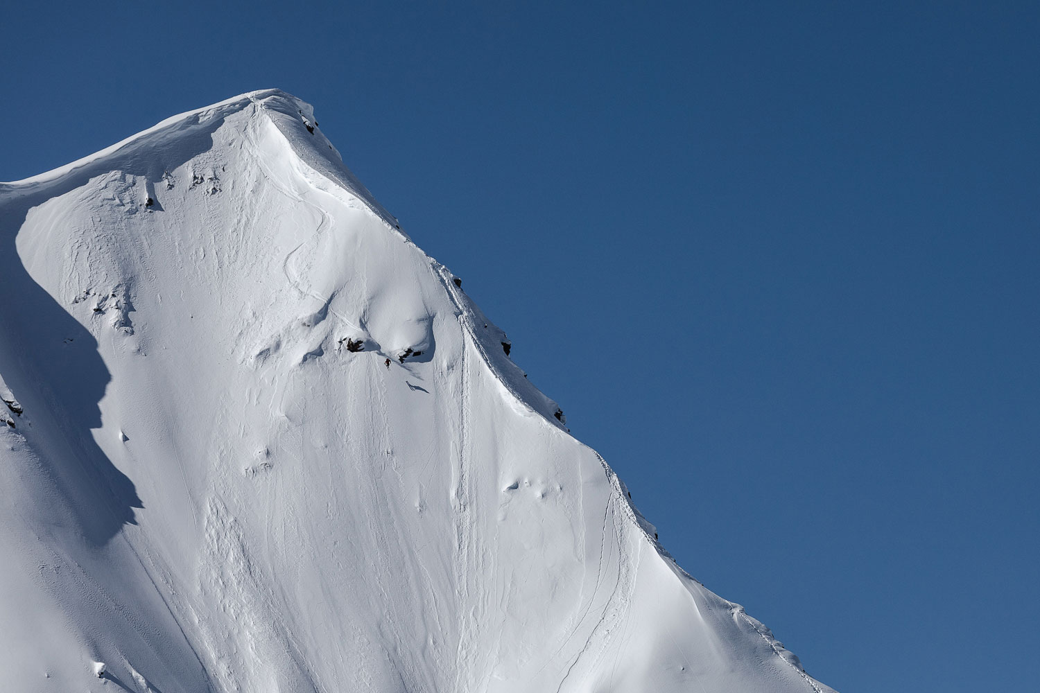 ケレブが先にドロップした。ピークから少し離れた淡い光がきれいに当たった尾根の上を、雪煙を巻き上げながら滑り降りていく。雪は良さそうだ。