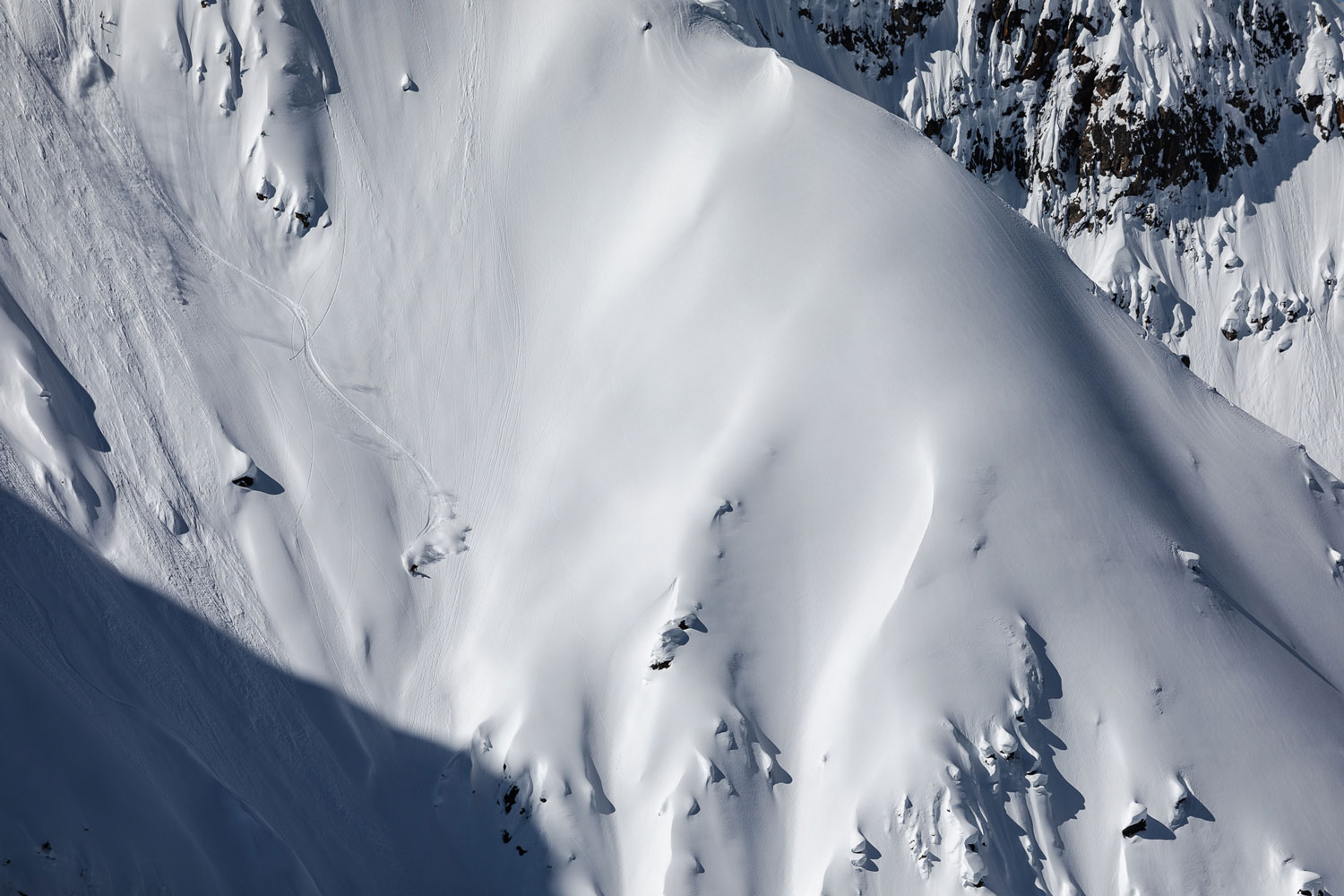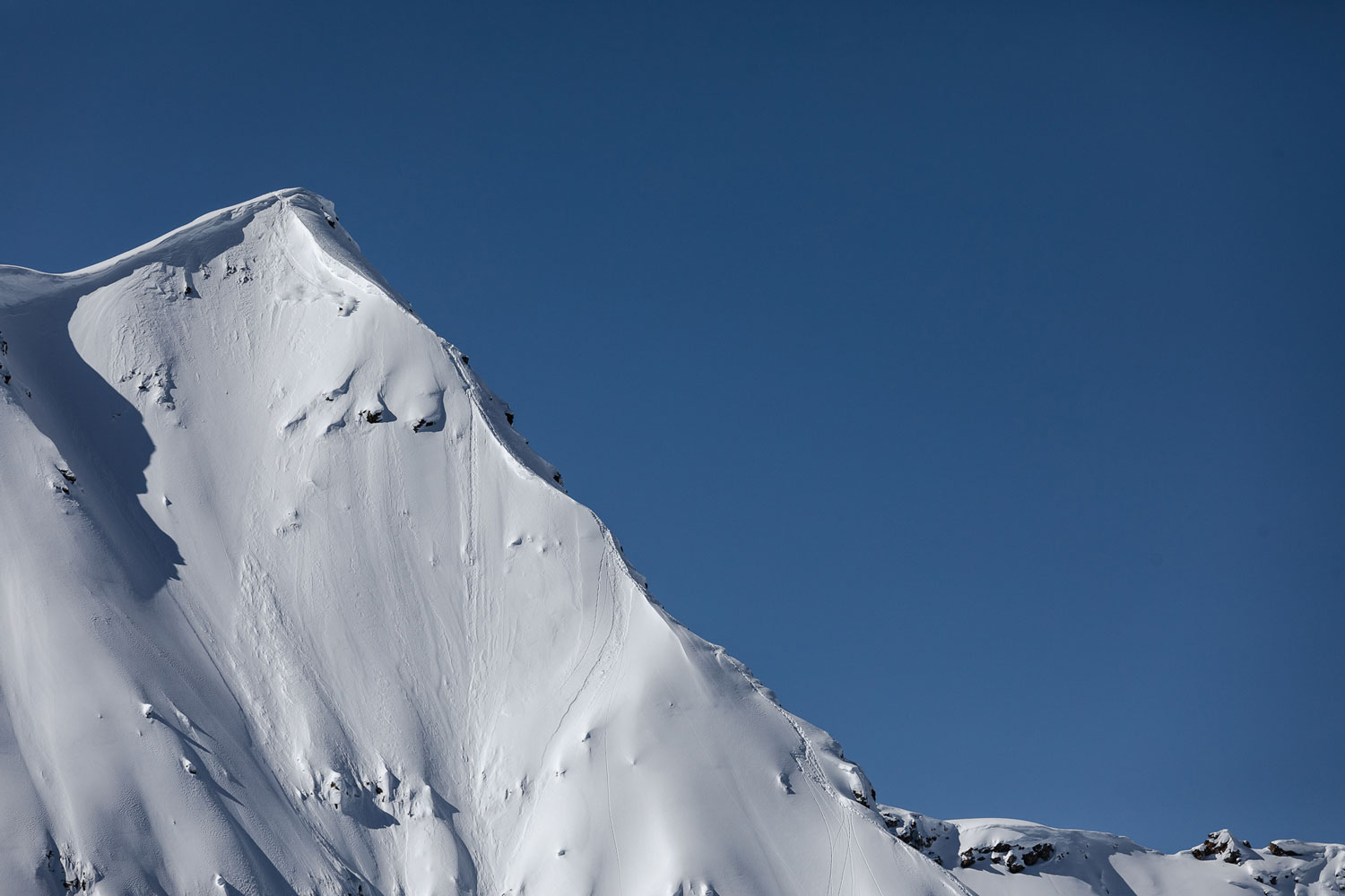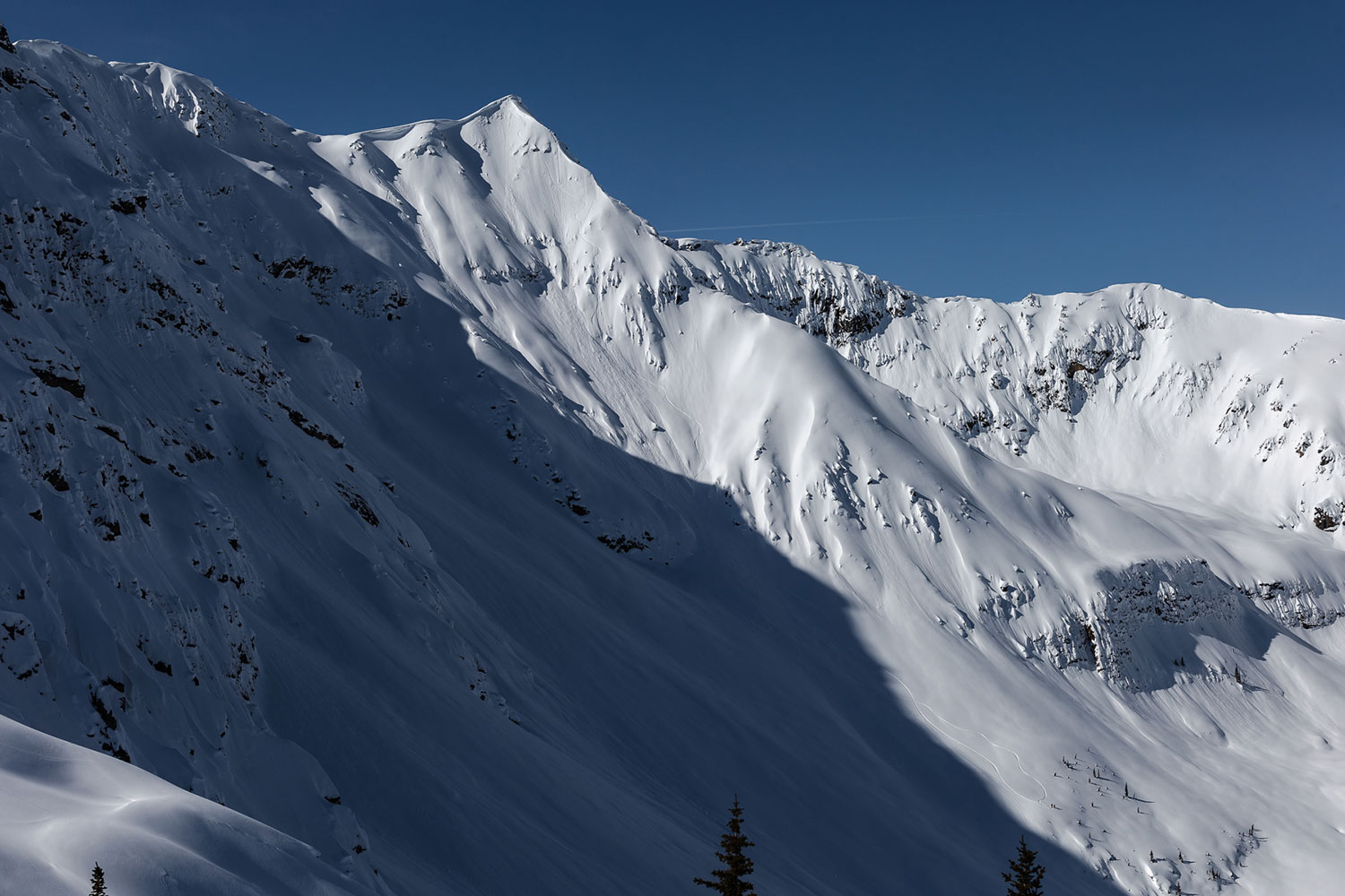 コアな滑り手なら誰もが頭のなかでシュプールを描く美しい斜面。僕もキッキングホースで滑るたびに、頭の中で自分のラインを刻んだが、深い谷で遮られて取り付くのが困難なこの斜面に、シュプールがついたのを見たことはなかった。