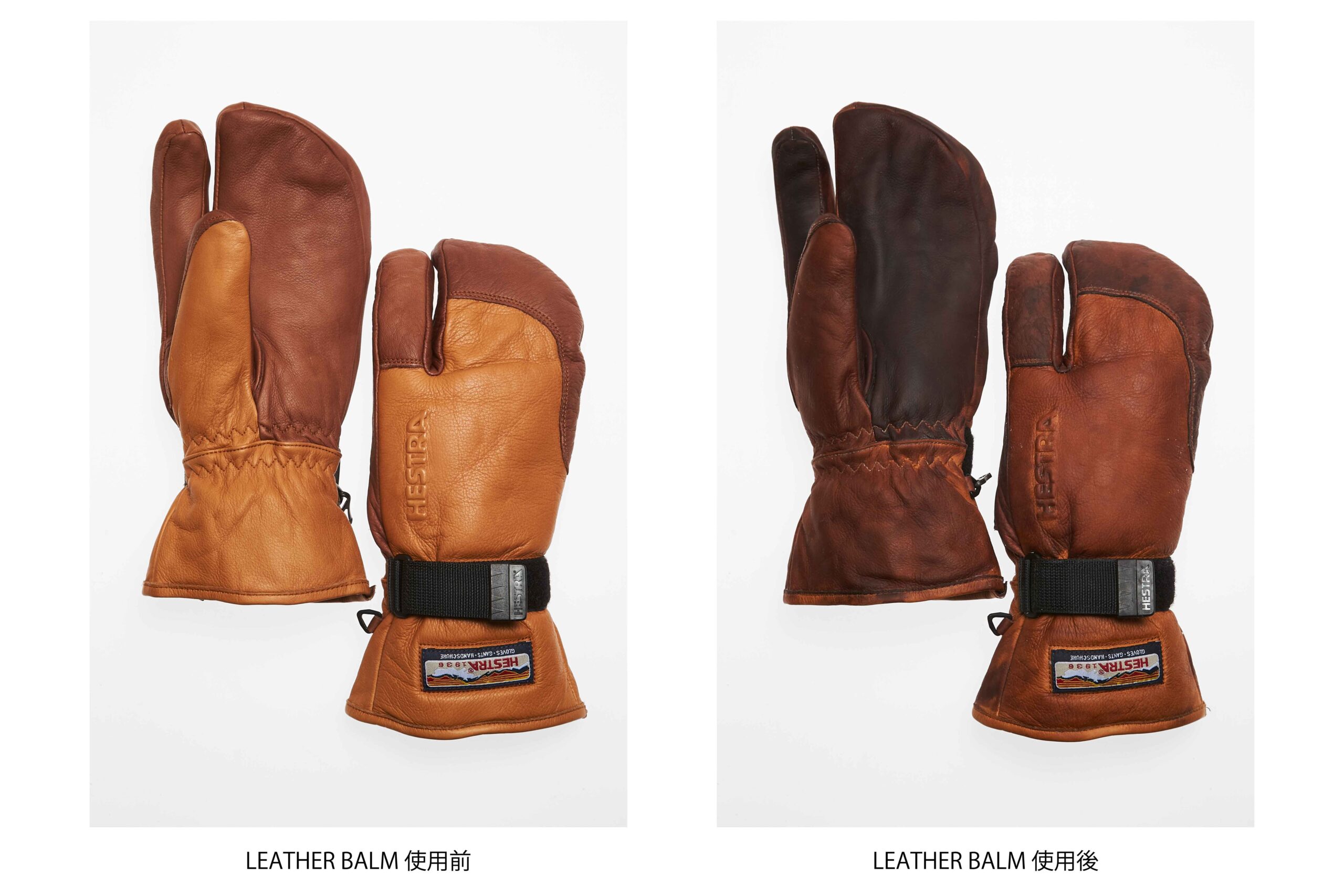 グローブをより長く使い続けるために必要な事。撥水性と耐久性を強化するため、グローブ使用後など下記手順でグローブの皮革にレザーバームを塗り込んでください。