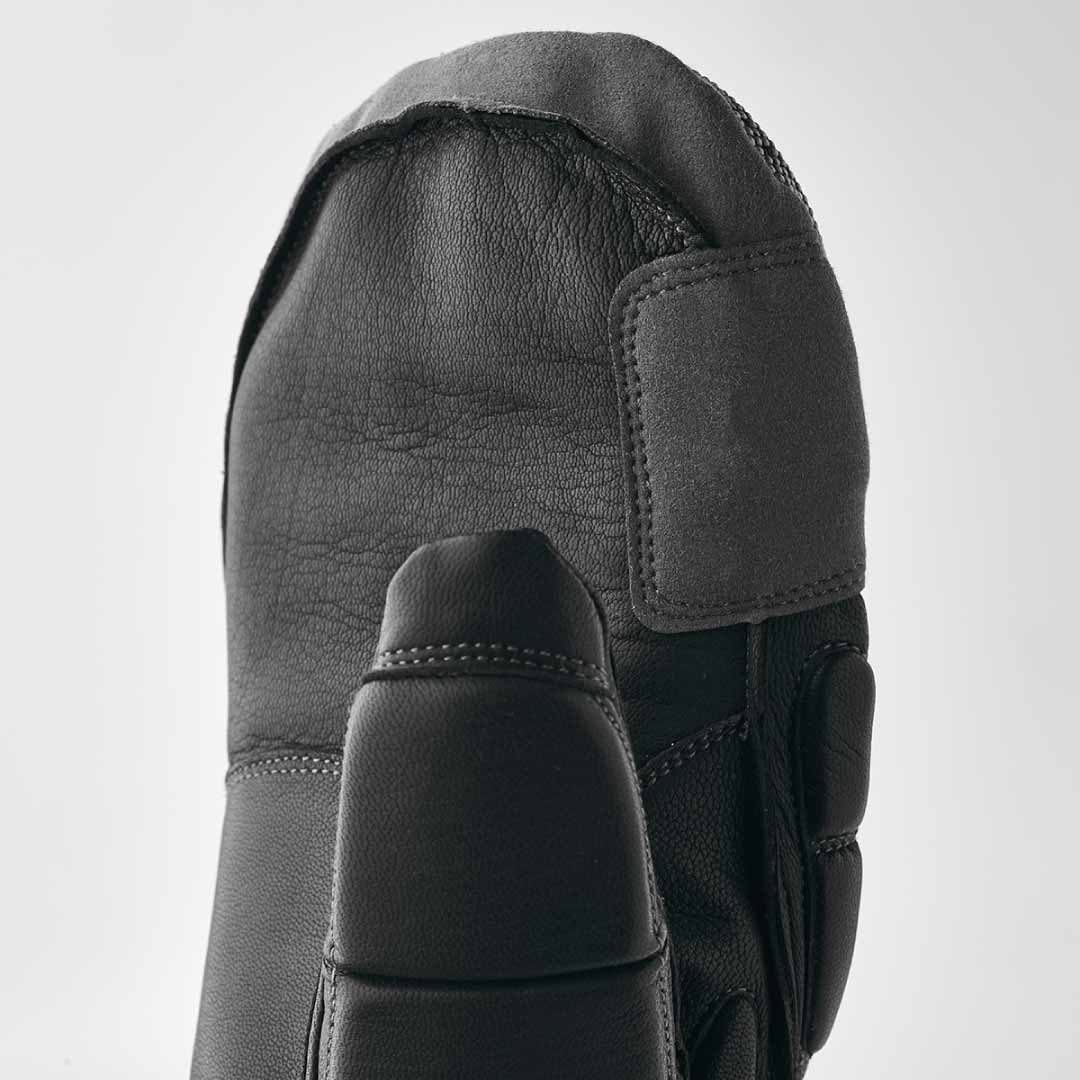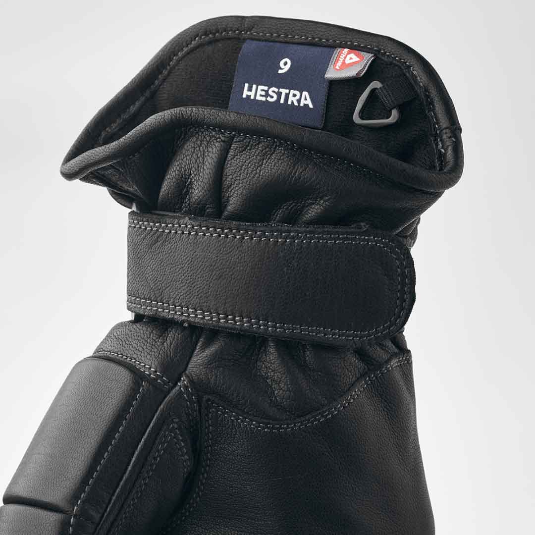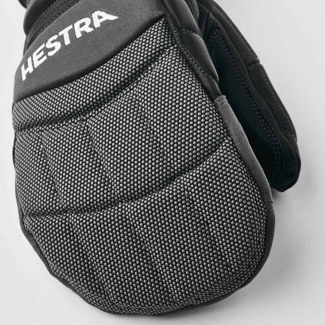 スウェーデンアルペンチーム所属の高速系選手と共同開発したレーシンググローブです。GSやスーパーGなど高速系種目では、深く体を倒し込んだ高速ターン時に、ポールを握るターン内側の手が氷化した固い雪面と接触します。そこで、雪面に当たる指の付け根から指先までの外側をセラミック繊維で保護しました。これにより雪面との摩擦係数が軽減され、なおかつ耐久性がアップしています。23-24シーズンのニューモデルですが、ベースになっているのは、定評あるHESTRAレーシンググローブで、甲と親指外側、ベルクロ留めの手首外側にはパッド入りです。手のひらは耐久性に優れたゴート(山羊)皮革を使用し、手の自然な形に添うような立体裁断を採用。内側のライナーは指が5本に分かれており、保温性の高い「プリマロフトゴールド」の中綿入りです。このミトングローブの他に、5フィンガー、3フィンガーと3モデルが揃います。