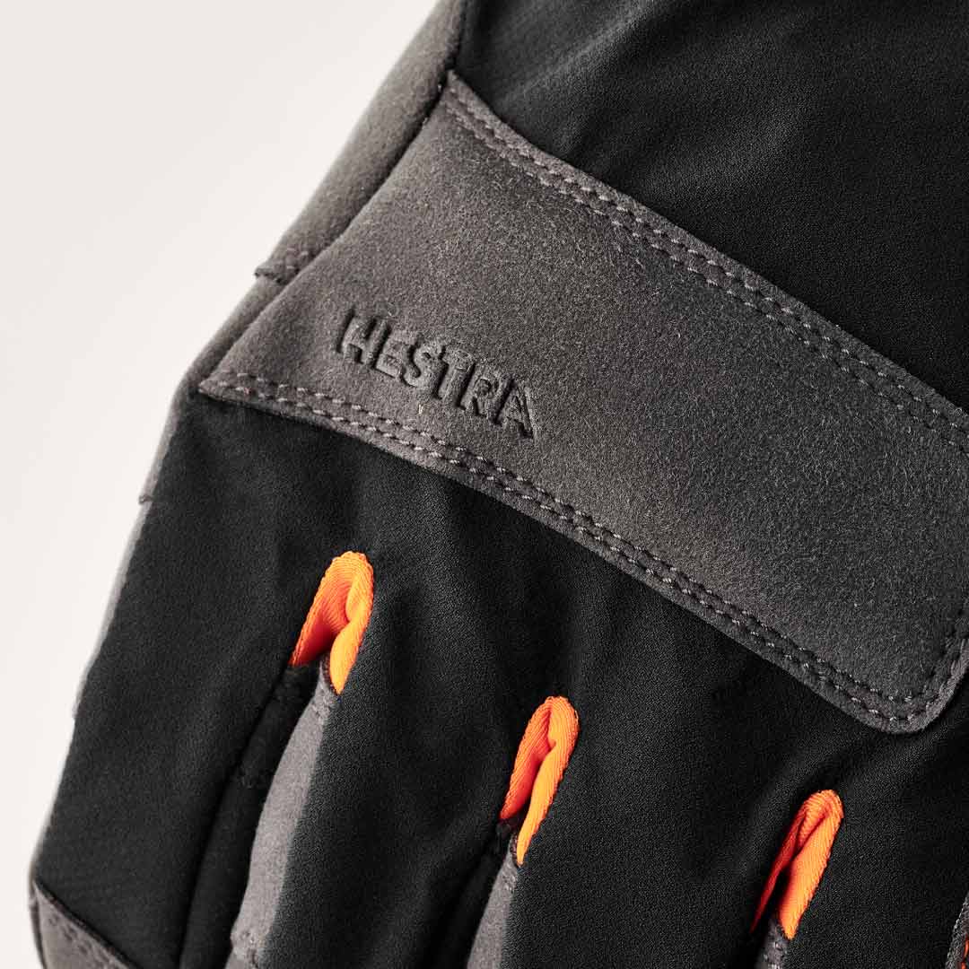 アイスクライミングを想定した防水クライミンググローブです。グローブ全体の表地と裏地の間に防水透湿性メンブレンのHDryを熱圧着した3層構造で、ライナーは起毛ポリエステル製。メンブレンが一体化しているため操作感にズレがなく、的確にアックスを振ることができます。さらに、自然な指の形状に合わせて立体縫製されたエルゴグリップにより、アックス操作やロープワークに違和感がありません。手の甲側にはしなやかなナイロンファブリック、手のひらには耐摩耗性に優れた合成皮革を採用し、氷や岩にぶつかりやすいナックル部分と、ロープやアックスで擦れる親指と人差し指の間は別パーツで補強済み。手首はフィット感のいいネオプレンカフにベルクログリップ付きです。
