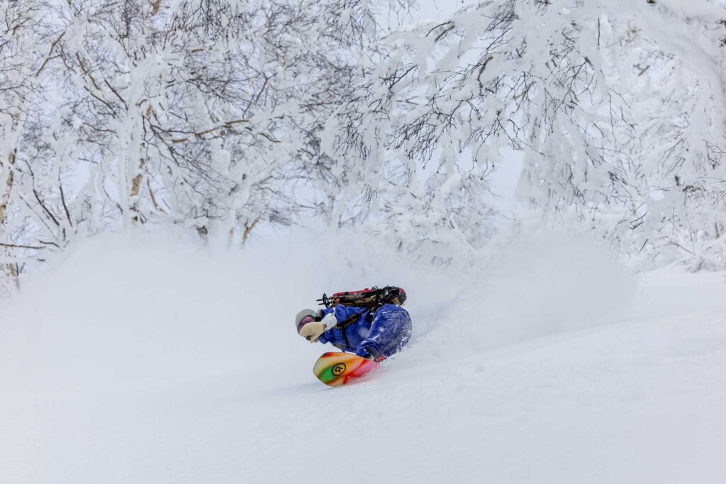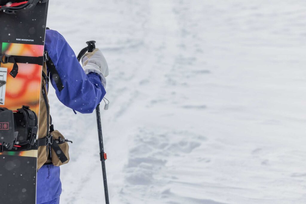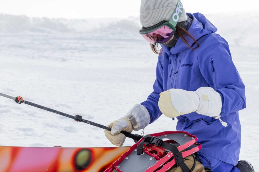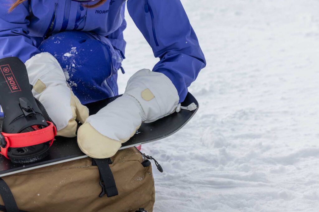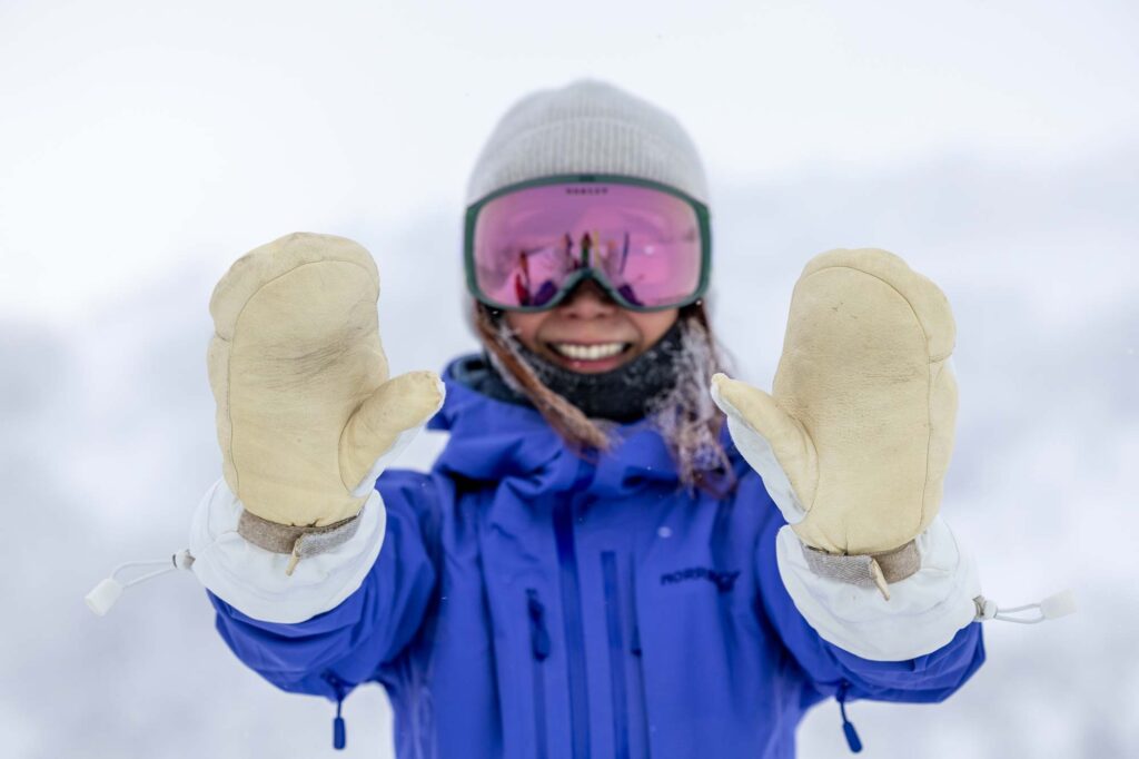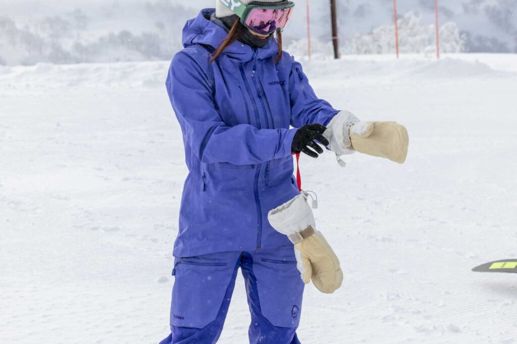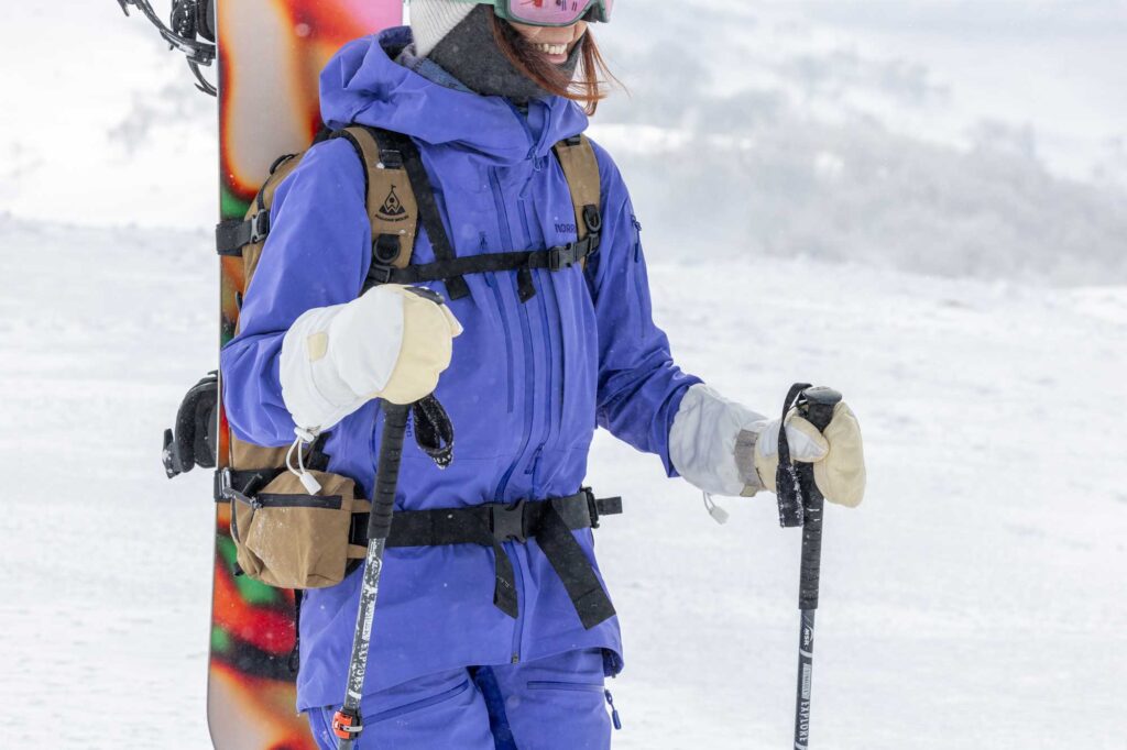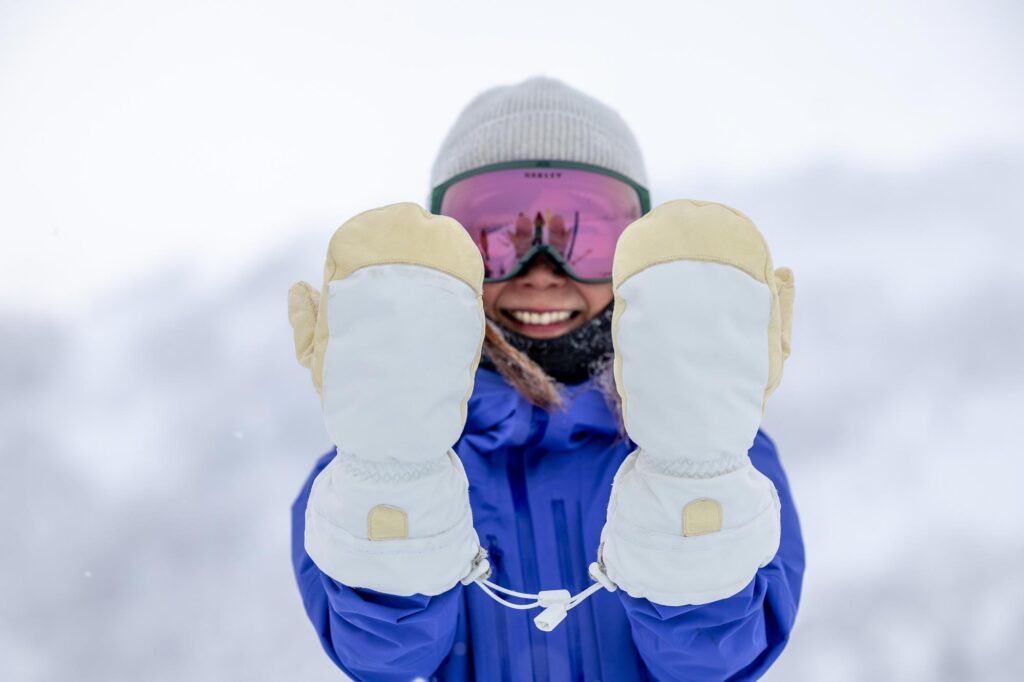 袖口にかぶせるタイプのグローブは初めてで、最初は抵抗があったが、手首が暖かく、デザインも可愛く、使っているうちにお気に入りになった。手のひらと指先は耐久性に優れた山羊の皮革、ほかはリサイクルナイロンで作られていて、暖かく、柔らかく、軽いので、グローブをつけたままでもスプリットボードのモードチェンジなど作業ができる。また、手首のベルトやコードストッパーなどのパーツ類は、すべてリサイクル素材を使用し、環境へ配慮している。私が使っているミトン以外に5本指モデルもあり、2024-25シーズンは黒ベースのカラーも新発売! どちらも欲しくなる。