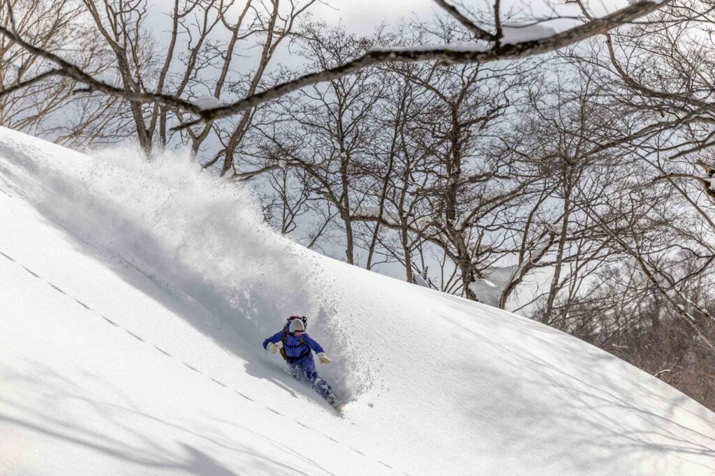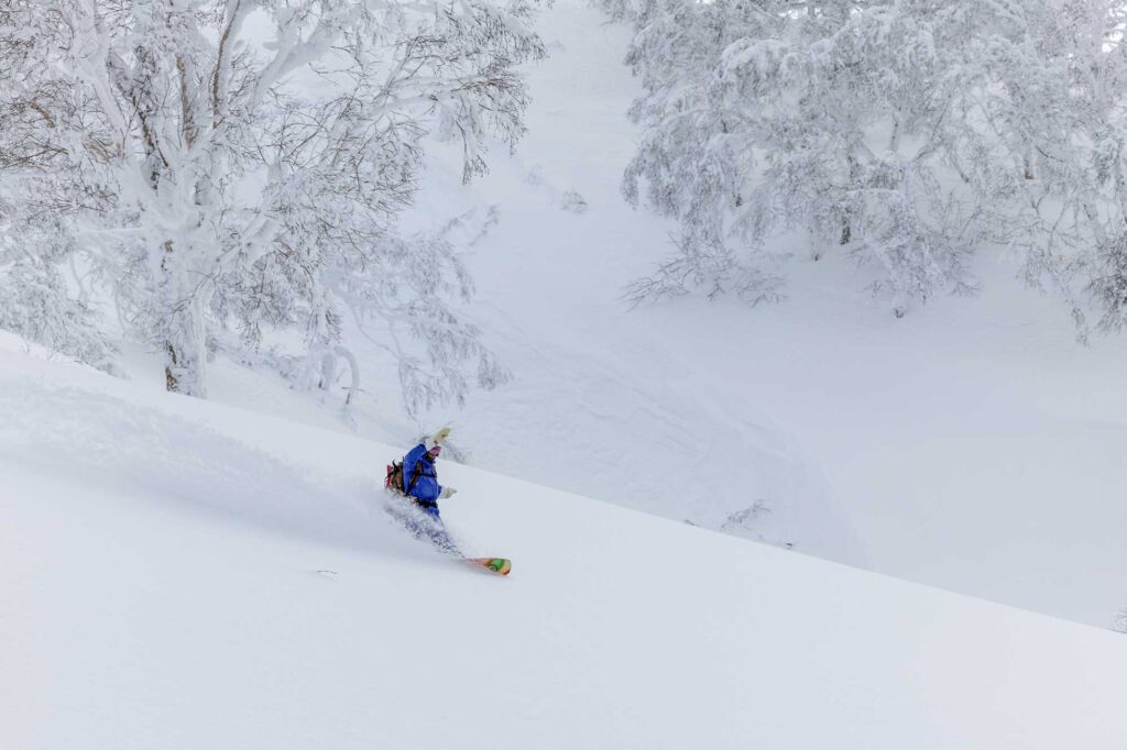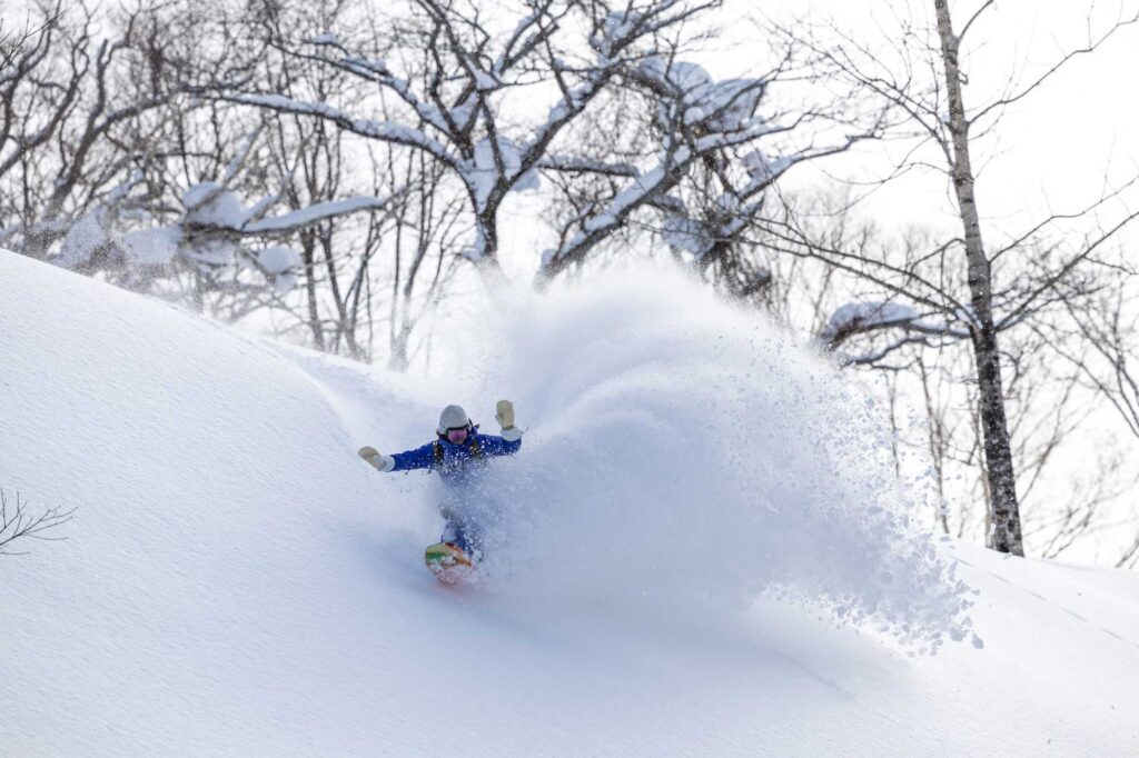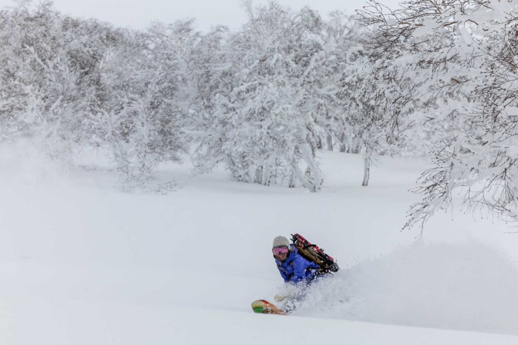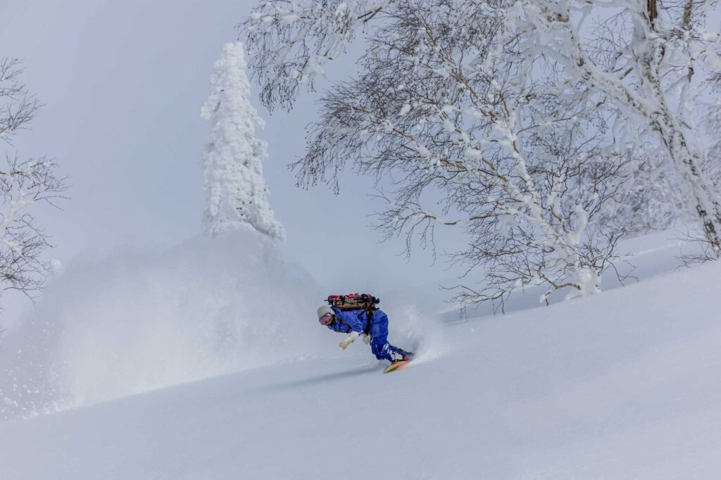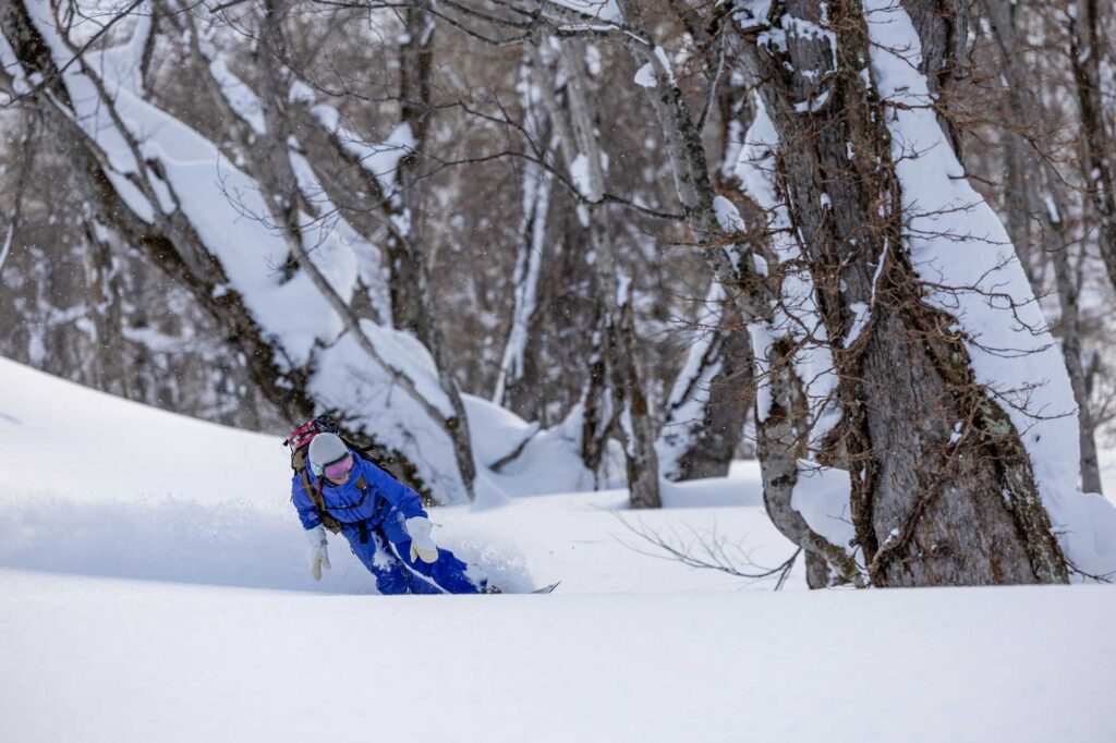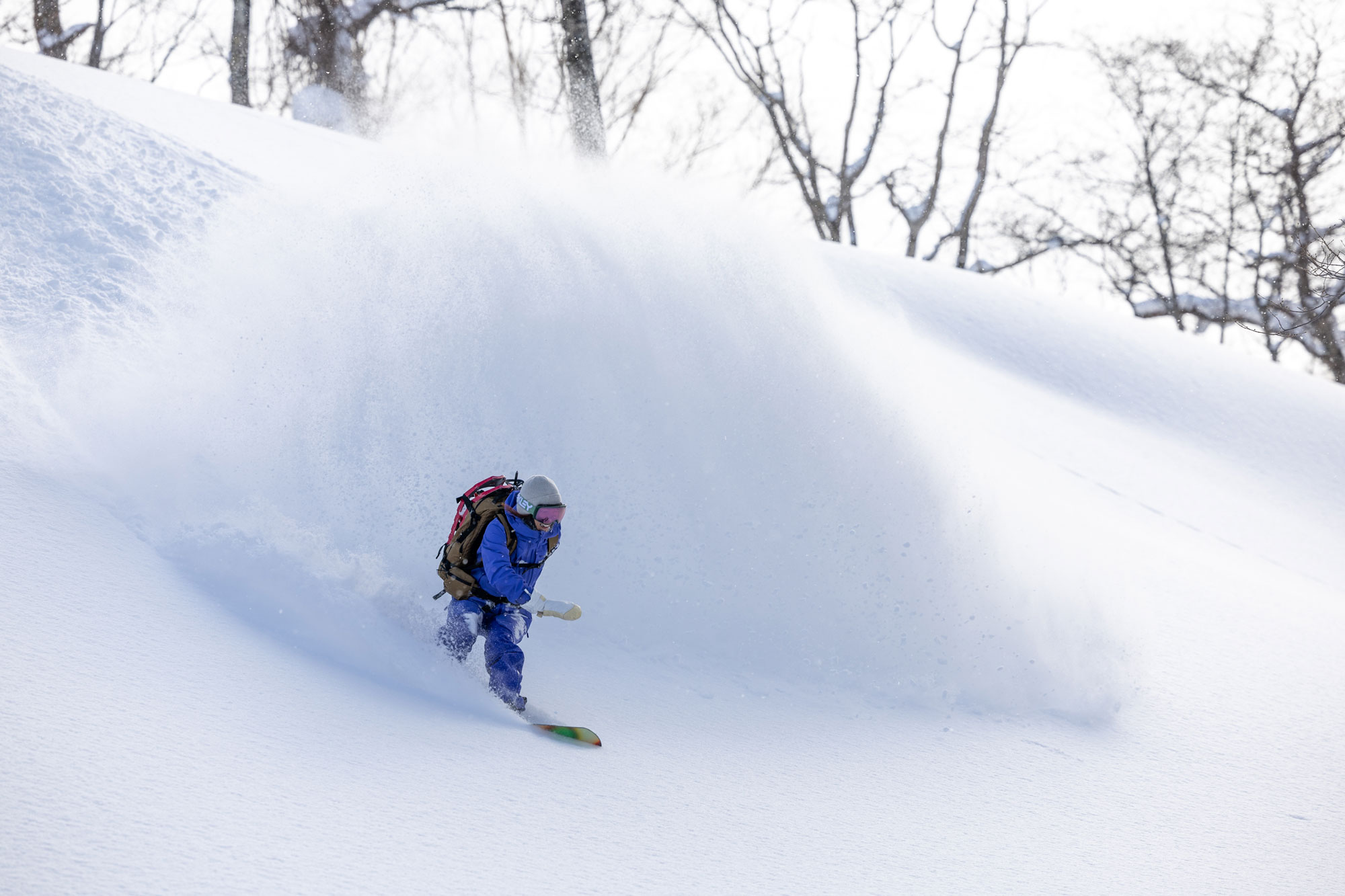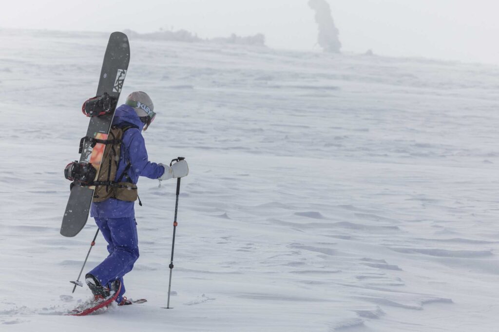 袖口にかぶせるタイプのグローブは初めてで、最初は抵抗があったが、手首が暖かく、デザインも可愛く、使っているうちにお気に入りになった。手のひらと指先は耐久性に優れた山羊の皮革、ほかはリサイクルナイロンで作られていて、暖かく、柔らかく、軽いので、グローブをつけたままでもスプリットボードのモードチェンジなど作業ができる。また、手首のベルトやコードストッパーなどのパーツ類は、すべてリサイクル素材を使用し、環境へ配慮している。私が使っているミトン以外に5本指モデルもあり、2024-25シーズンは黒ベースのカラーも新発売! どちらも欲しくなる。