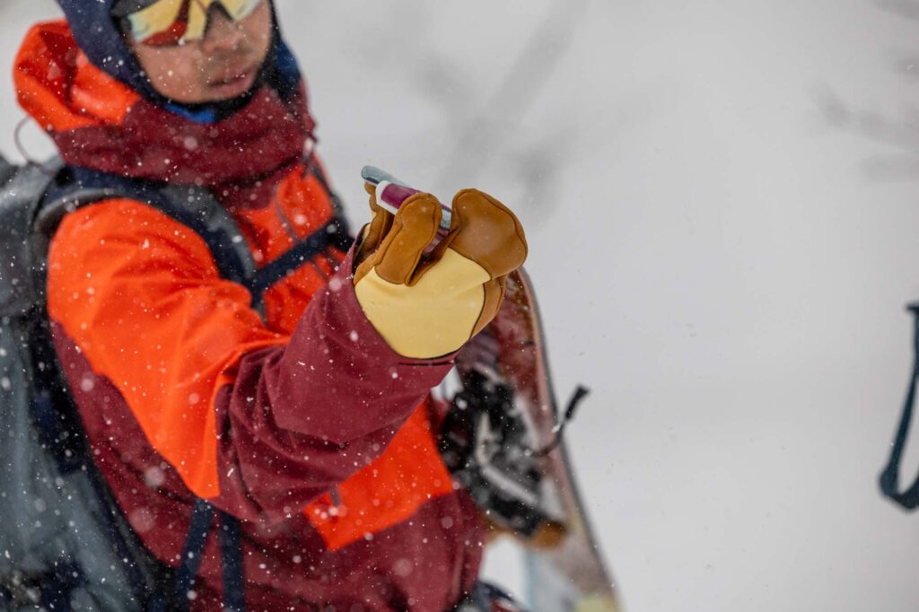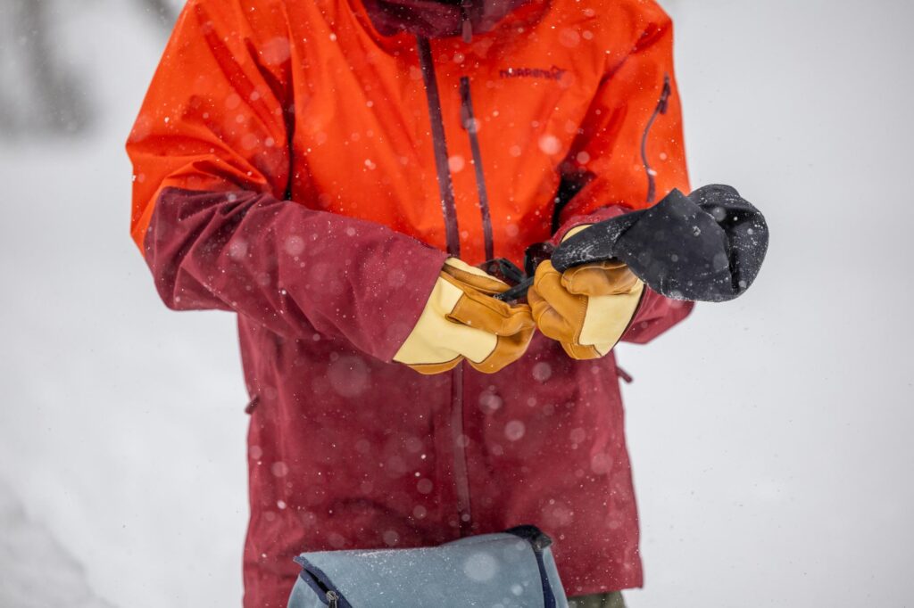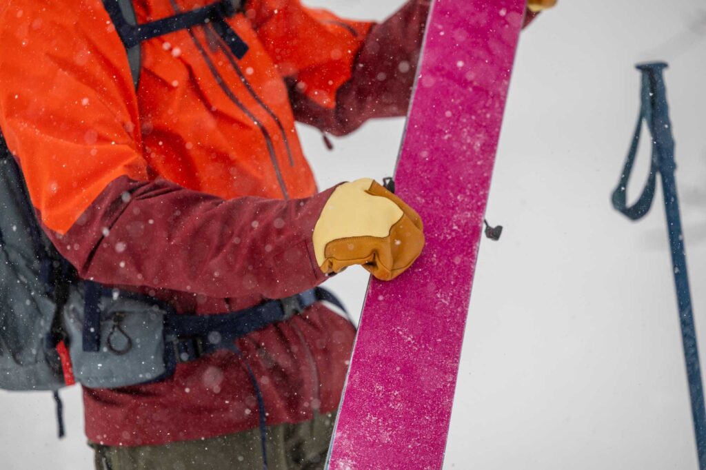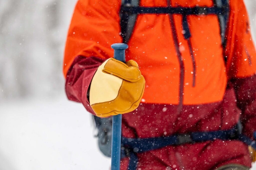 ストックの握りが良く、かつ温かいところ。5本指だと作業がしやすかったりストックの握りも良いが、ハイシーズン1月から2月は気温も低くなるので暖かいものを身に着けたい。人差し指と親指が独立しているのでほとんどの作業がストレスなく行うことができる。