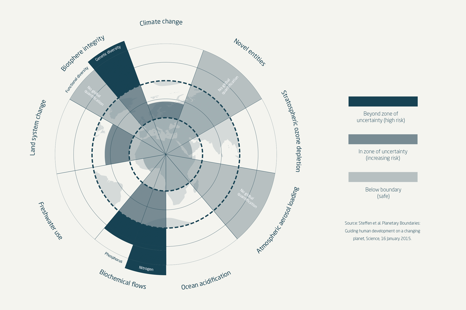 The Planetary Boundaries: 水色で示したゾーンは人間が活動できる安全な領域(限界値以内)で、中間の青は不安定な領域(リスク増加)を表し、これは地球システムの安定性を混乱させる危険性が高まっていることを示す。濃い青はすでに差し迫った高いリスクにさらされたゾーンであり、地球環境における限界値は点線で示されている。