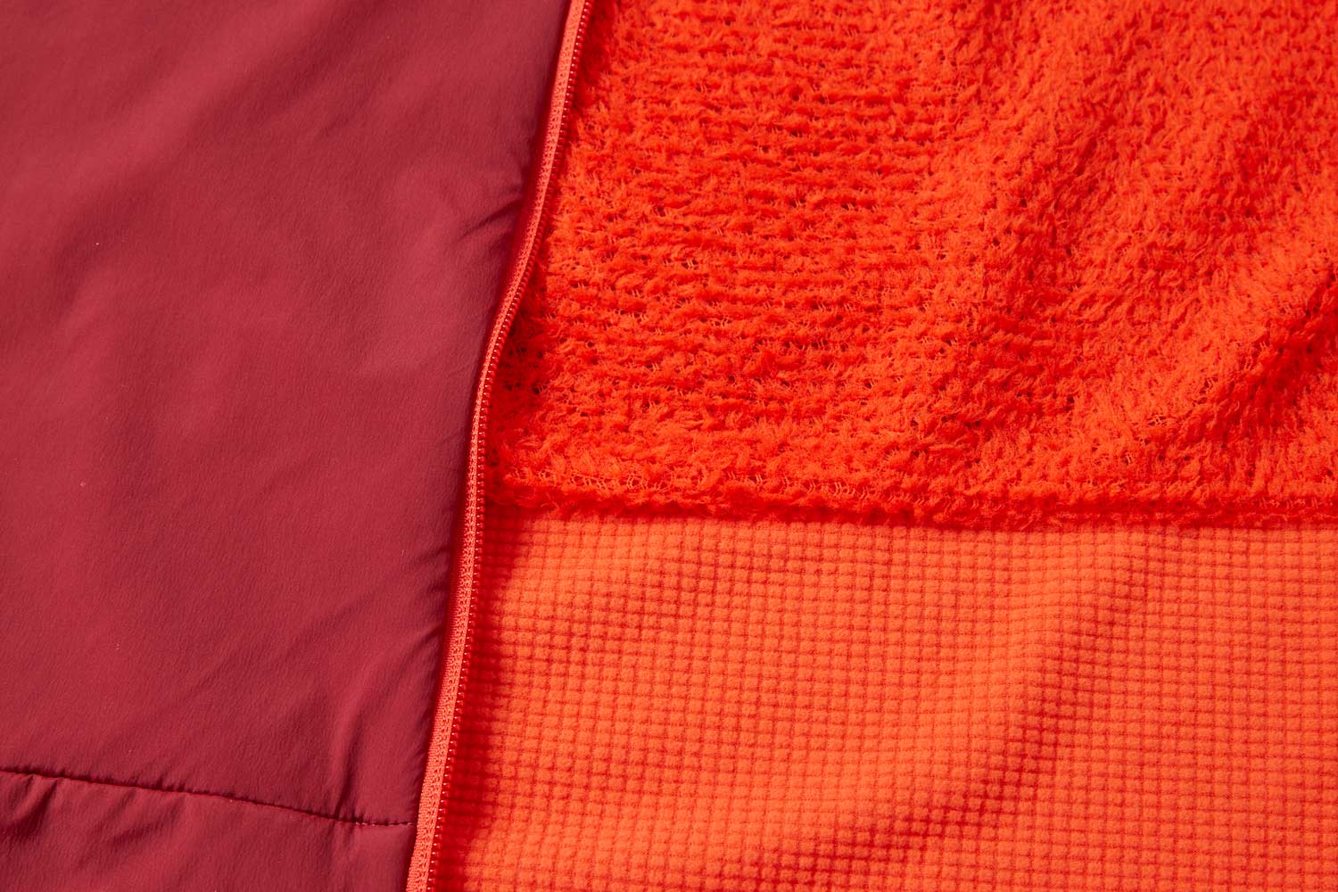 次に汗をかきやすく、ムレの原因となる背中・腕の外側・腹部には、通気性と保温性のバランスに優れたアルファダイレクト。そして、それらを繋ぐサイドパネルと腰回り、それから腕の内側とフードには、ストレッチ性の高いポーラテックパワーグリッドを配置して吸汗速乾性を高めつつ、着心地に自由度を与えています。