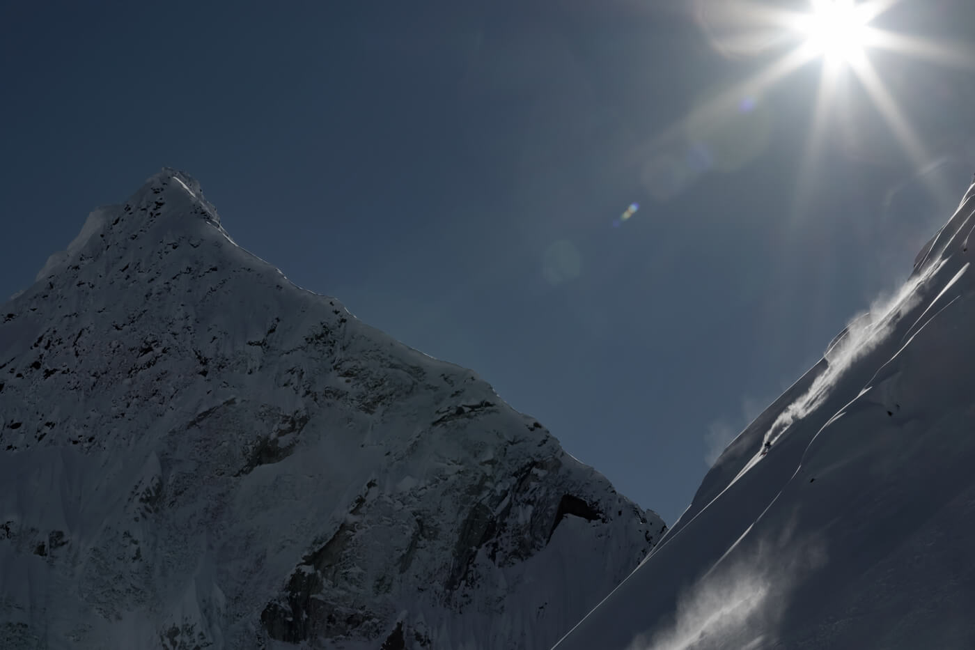 北米大陸最高峰デナリの難ルートとして知られるカシンリッジをスキーを背負って登攀し、世界で初めて南西壁スキー滑降に成功した。 Photo: Takao Araiba