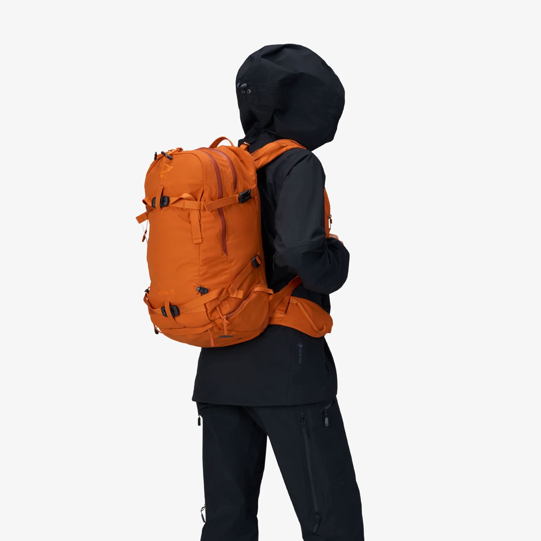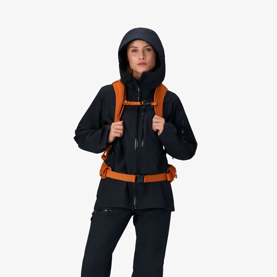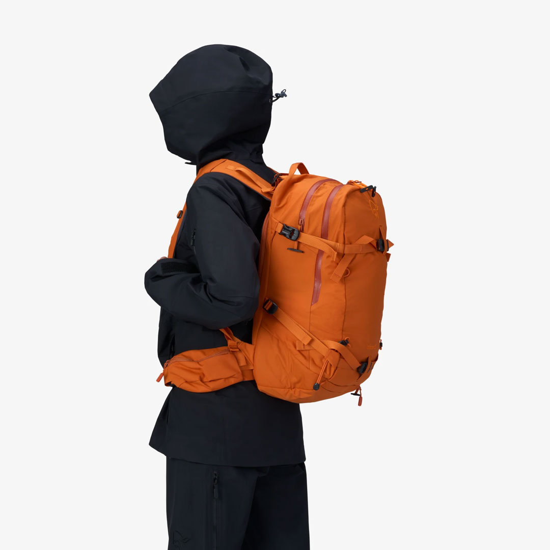 耐久性の高いマウンテニアリング・スキー/スノーボードバックパックです。30L Packよりも背面長が短く、女性や小柄な男性の為に作られました。板を取り付けたままメインの荷室へアクセスできる背面エントリー仕様。バック上部にはゴーグルが 2つ入る十分なスペース、前面にはアバランチギアを整頓して収められる仕切りを備え、底部サイドには背負ったままアクセスできる水筒、クランポン、ロープなどを収納できる荷室があります。ヘルメットを取り付けられ、内側に雪が流れ込むのを防ぐブリザードネットがボトムに装備されています。ヒップベルトには小物を入れられるポケットとギアループが配されています。メインファブリックは耐久性に優れた320デニールのECONYL?素材(リサイクルナイロン)で、高品質であり資源の再生プロセスを実現しています。また、耐水圧2000mmのPUコーティングが施されています。