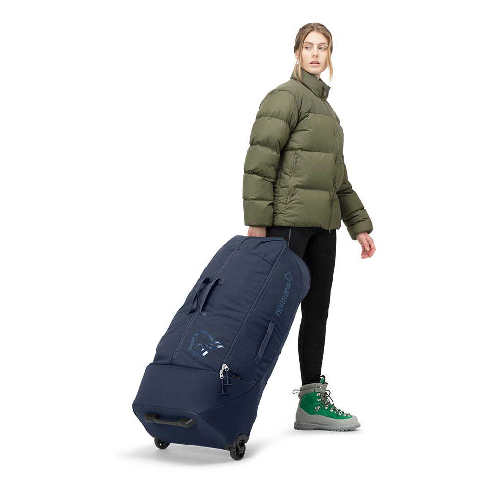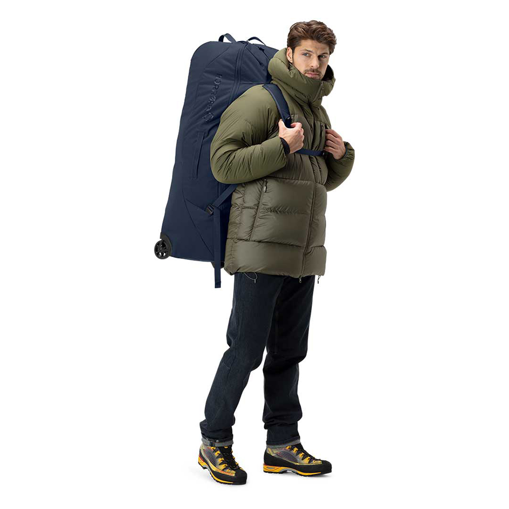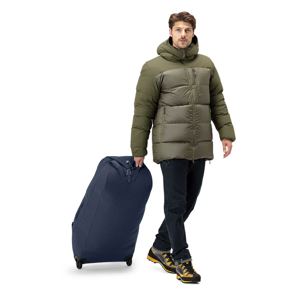 耐久性に優れながら軽量性と収納性を追求したトラベルバックです。メインファブリックには100%廃棄物からリサイクルされた450デニールナイロン生地を用い、ボトムとなる部分は更に頑丈な900デニールナイロンを使用しています。どちらの生地にもPUコーティングが施され耐水圧は2000mmを持っています。バッグには85mmの車輪が付いており、荷物を快適に輸送・保管することができます。通常の短縮するTバーの代わりに、斜めに2つの取っ手を上部に配置することで、快適な移動を確保し、バッグが足の踵に当たるのを防ぎます。また、背面に金属製の骨組み用いていない為ロールアップしてコンパクトに収納することが可能です。調節可能なパッド付きのショルダーストラップを使用すればバックパックとしても使用できます。ショルダーストラップは使用しないときにはフロントの”スリットに簡単に収納することができます。フロントのU字ジッパーはフルレングスに近い開口が可能ですべての持ち物に簡単にアクセスできます。バッグには1つの大きなメインコンパートメントがあり、両サイドにはメッシュポケットが付いています。フロントポケットにはキーフック付きの小さなメッシュコンパートメントがあり、上部には名刺やIDカードなどが入る小さなポケットが付いています。背面と側面には中身を衝撃から守るソフトパッドが入っており、ジッパーのスライダーには小さな錠を付けてセキュリティを強化することができます。トップ、フロント、サイドには、持ち上げて移動するのに便利な複数の取っ手が付いています。T字型のジッパープラーは手袋やミトンを着用している場合に最適な、より良いグリップを提供します。