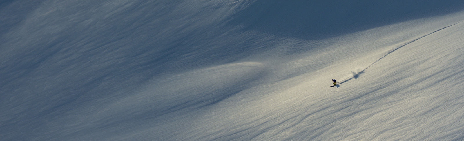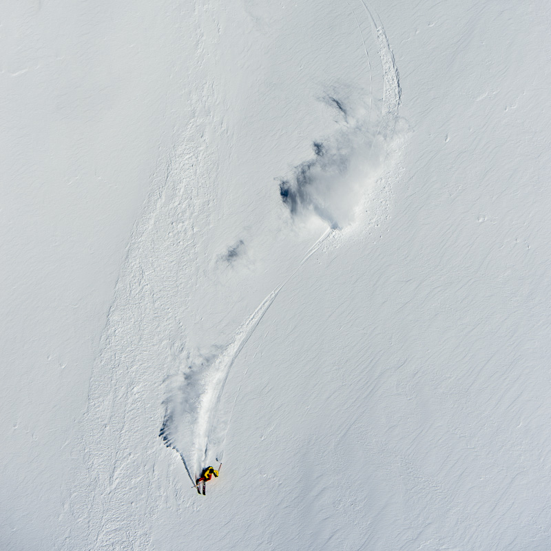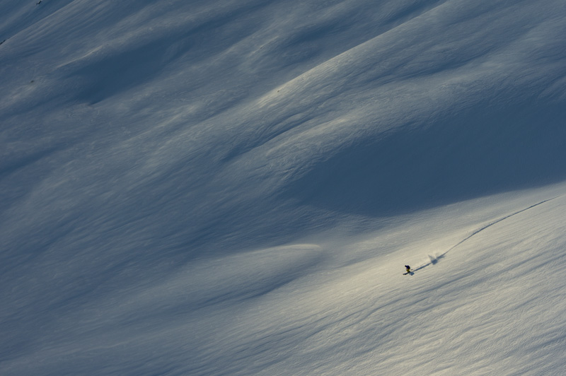 Christineは雪質を体感するため、またウォームアップも兼ねて、山の側面から滑り始めた。夜間に激しい風が吹き荒れ、降り積もったばかりの雪の上を滑りたい衝動に駆られたが、まずは冷静さを失わないことが大切だ。Christineは、雪が崩れ始めた際に危険な状態になる可能性があるスポットや断崖を避け、短く安全なコースを選んで滑走していった。だが、2、3回ターンしたところで雪面は崩れ、Christineはコースの下方まで雪まみれになりながら下降していった。予め用心していたので、大事に至らなかったのは幸いだった。雪片は厚くはなかったが、我々が選んだ雪面はより険しく、長く、岩が集結する凸状の山腹で、小さな雪崩が起きれば、とても危険な状態となる可能性があった。我々はこの事実を自然からの重要なサインであると受け止めた。今日は、広大で険しい雪面を滑るに相応しい日ではないのだ。