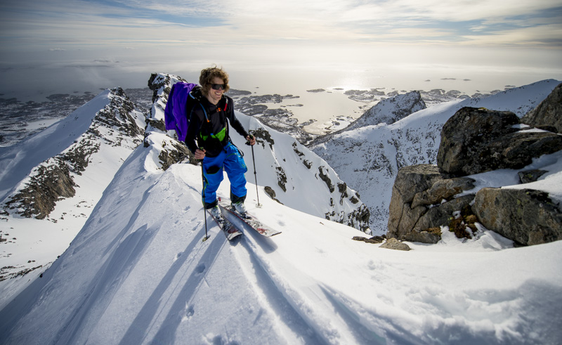 我々はブーツを調節し、フィヨルドに向かって滑り出す地点まで向かう途中であったが、しばし足をとめて目の前に広がる光景を眺めていた。Norrøna のアンバサダーであるChristine HarginとTobi Tritscherにとって、ロフォーテン諸島のスキーは初めての体験だったが、すでに彼らはこの地に魅了されているようだった。フリーライディングの世界チャンピオンであり、スカンジナビアのフリーライド選手権でも優勝しているスウェーデン人のChristineは、ロフォーテン諸島でマウンテンスキーをフルに楽しむことができるはずだ。オーストリア人のTobi Tritscherと、ノルウェー人のEven Sigstadは、この地を訪れるのは初めてではなかったが、ここでは新米のように思えた。ロフォーテン諸島では、ハイレベルなフリースタイルのテクニックとアルペンスキーの豊富な経験が求められるのだ。