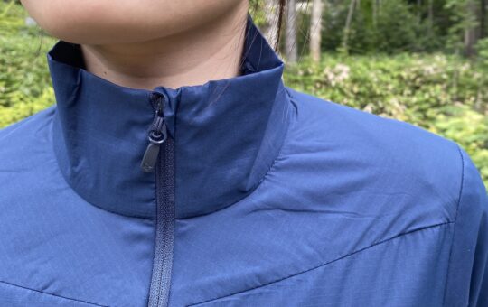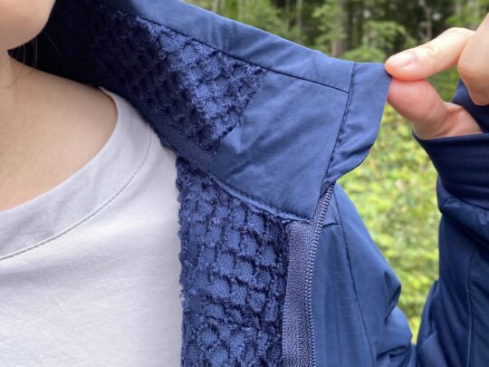 襟元が高い為、冷えるときにはファスナーを全閉にすることで保温力アップが