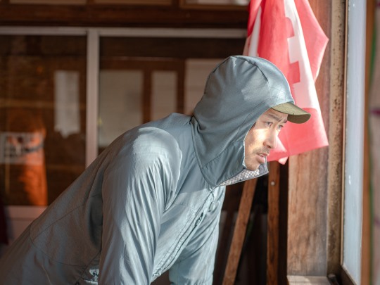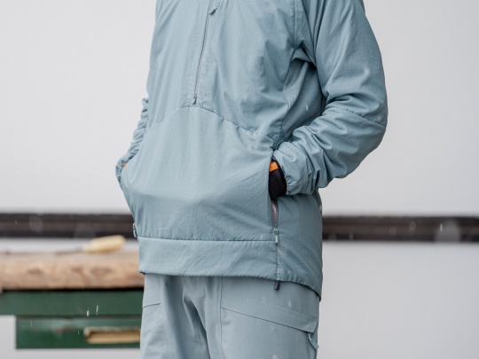 基本的には暖かさをコントロールするミッドレイヤーですが、効果的にウィンドシェル生地を使用することで、時にはジャケットを脱いでアウターとしても機能する1枚となります。