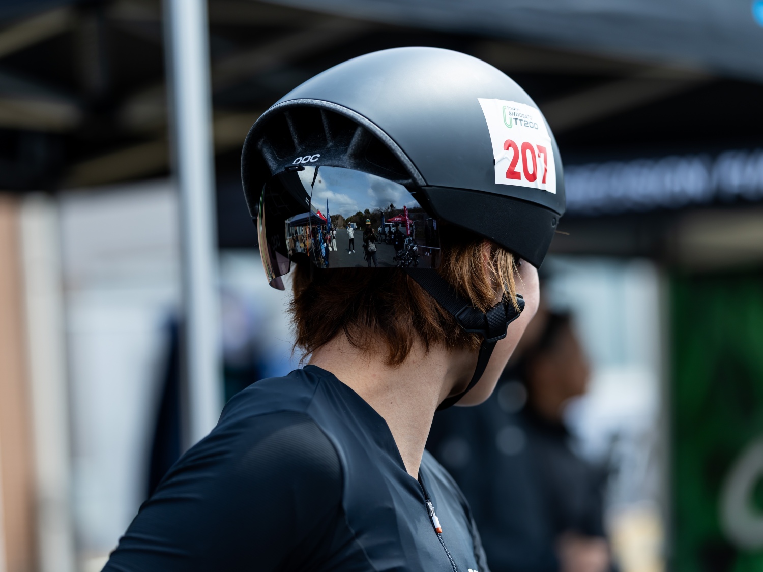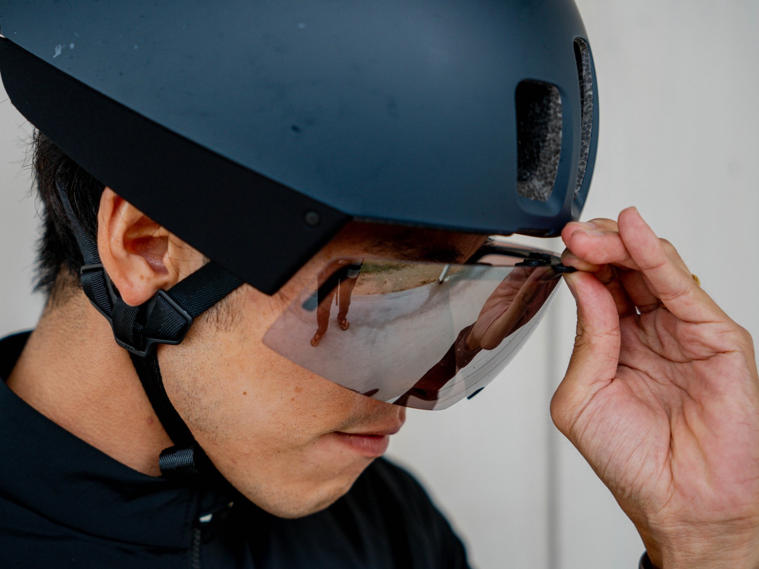 レンズもヘルメットの一部としてデザインされ、レンズから後方にスムーズに空気を流すイヤーカバーが設けられ、エアロ効果を最大限に考えられているのが分かります。