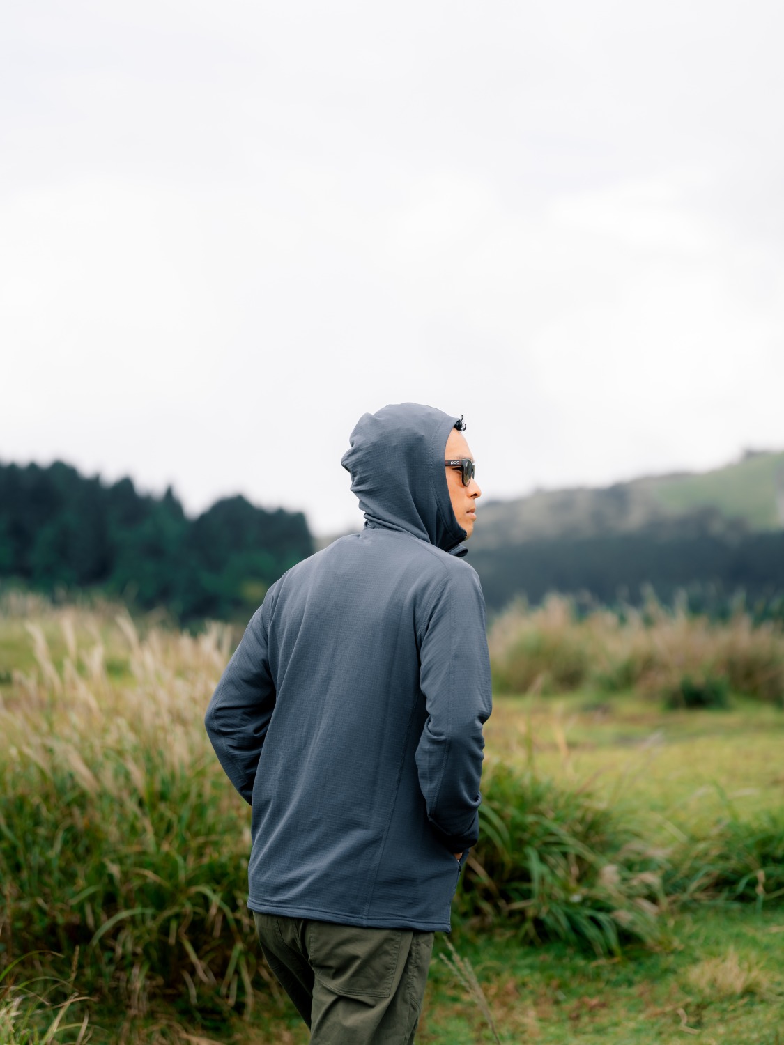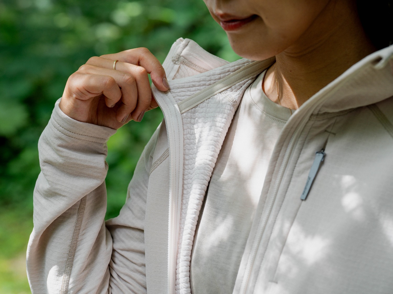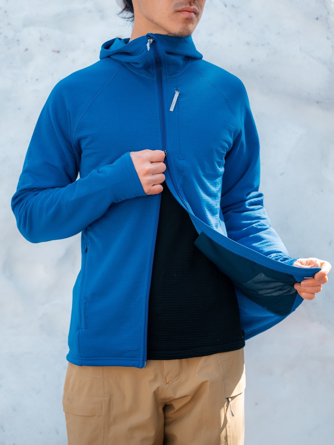グリッド構造と同じく通気性や生地の肌離れがいいため、比較的暖かいシーンで汗をかいた時も、毛足のあるフリースと比較しても快適に過ごせます。
