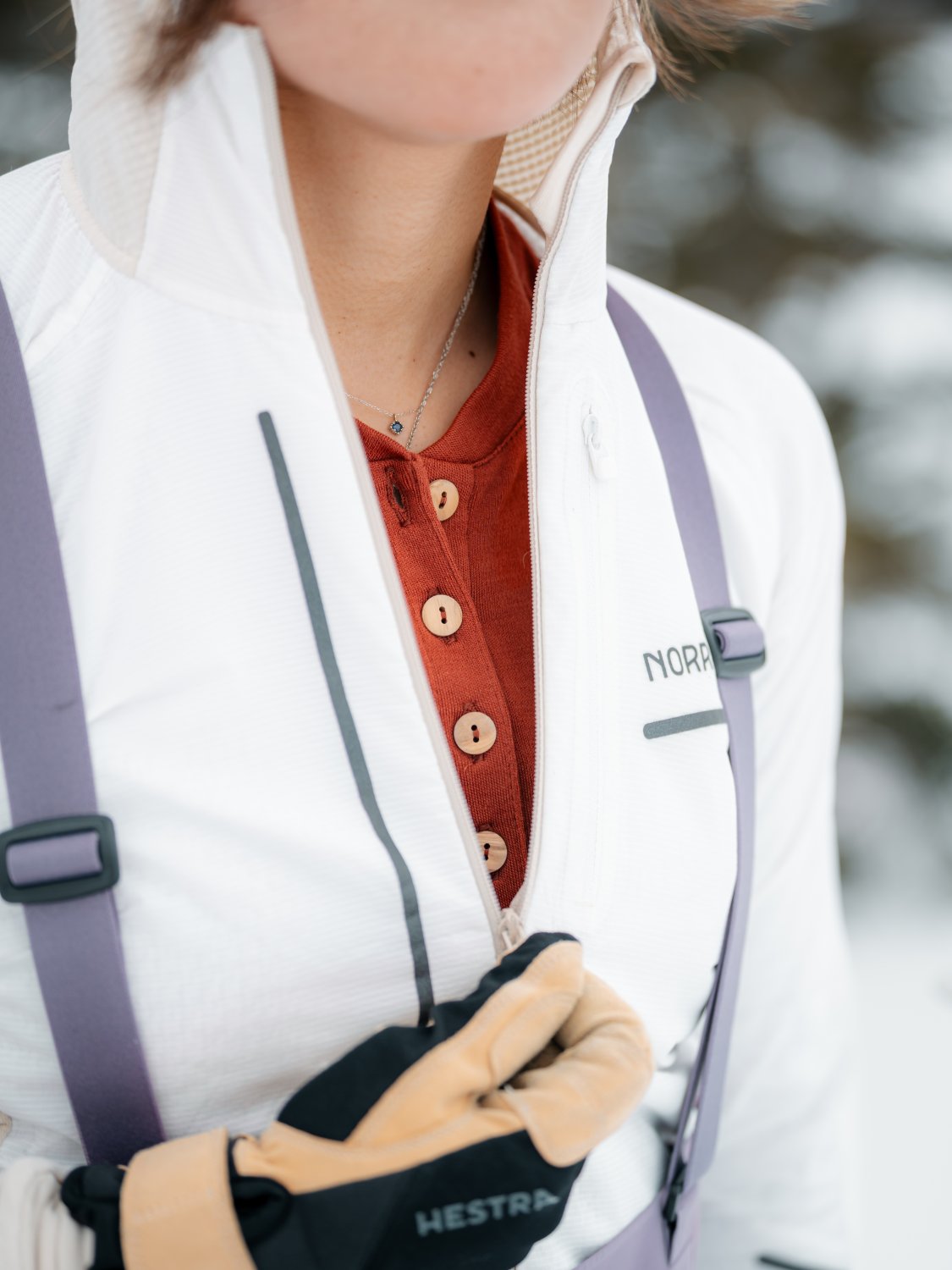 スノーシーンなどで、ビブやサロペットのようなパンツとの相性も◎