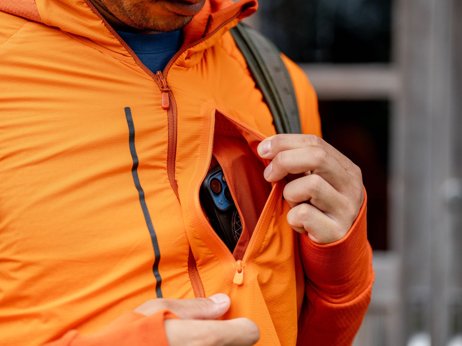 そんな状況が起こりやすい前身頃や肩上部~袖上部については、防風性がありつつ極力通気性を損なわない薄手ウィンドシェルが貼られた、Polartec® アルファダイレクト(95/m²)を配置。
