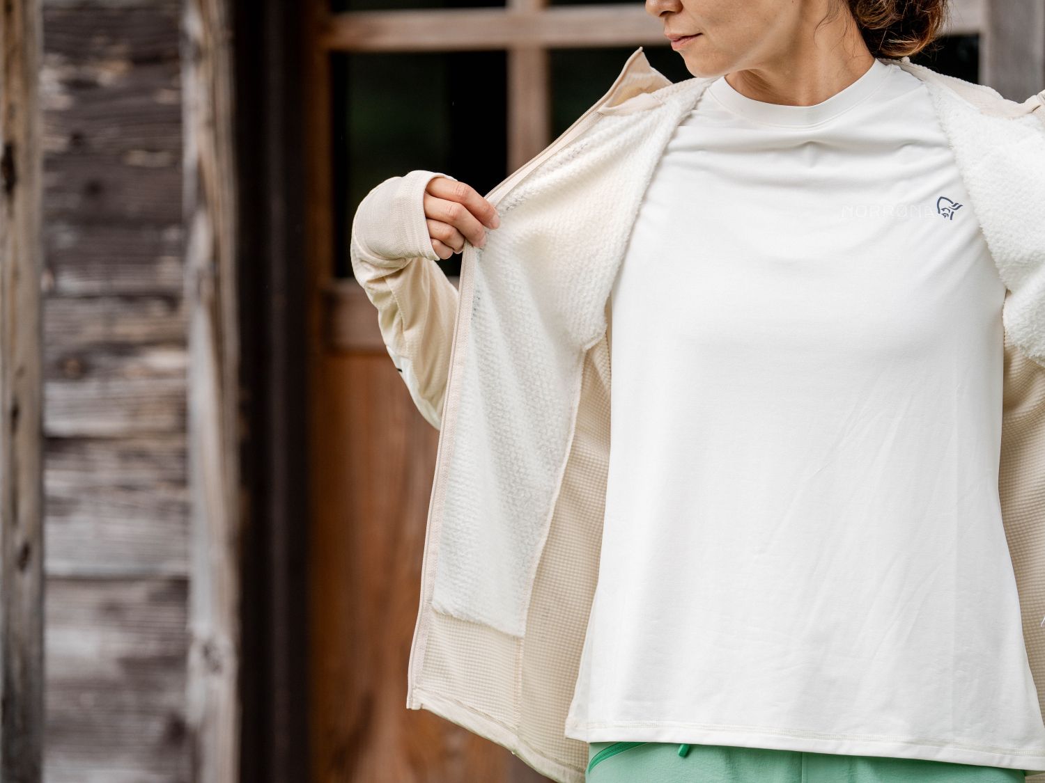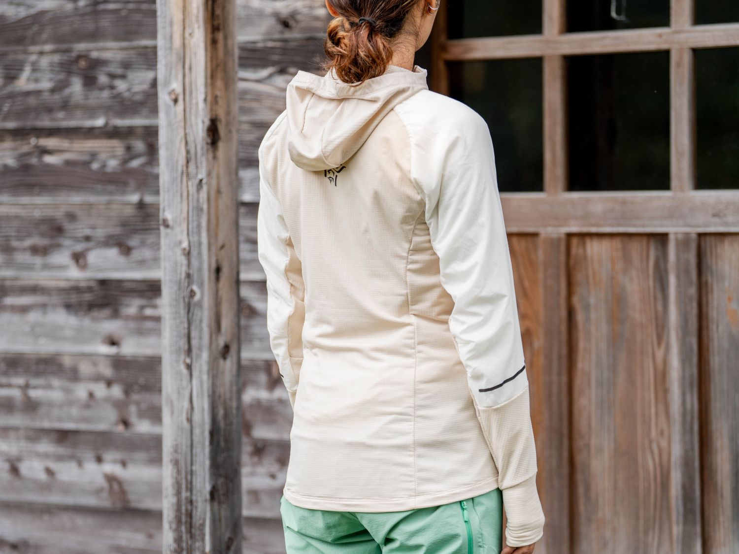 フード~背面、袖内側~袖口にかけては、Polartec® パワーグリッドを大胆に使用しています。