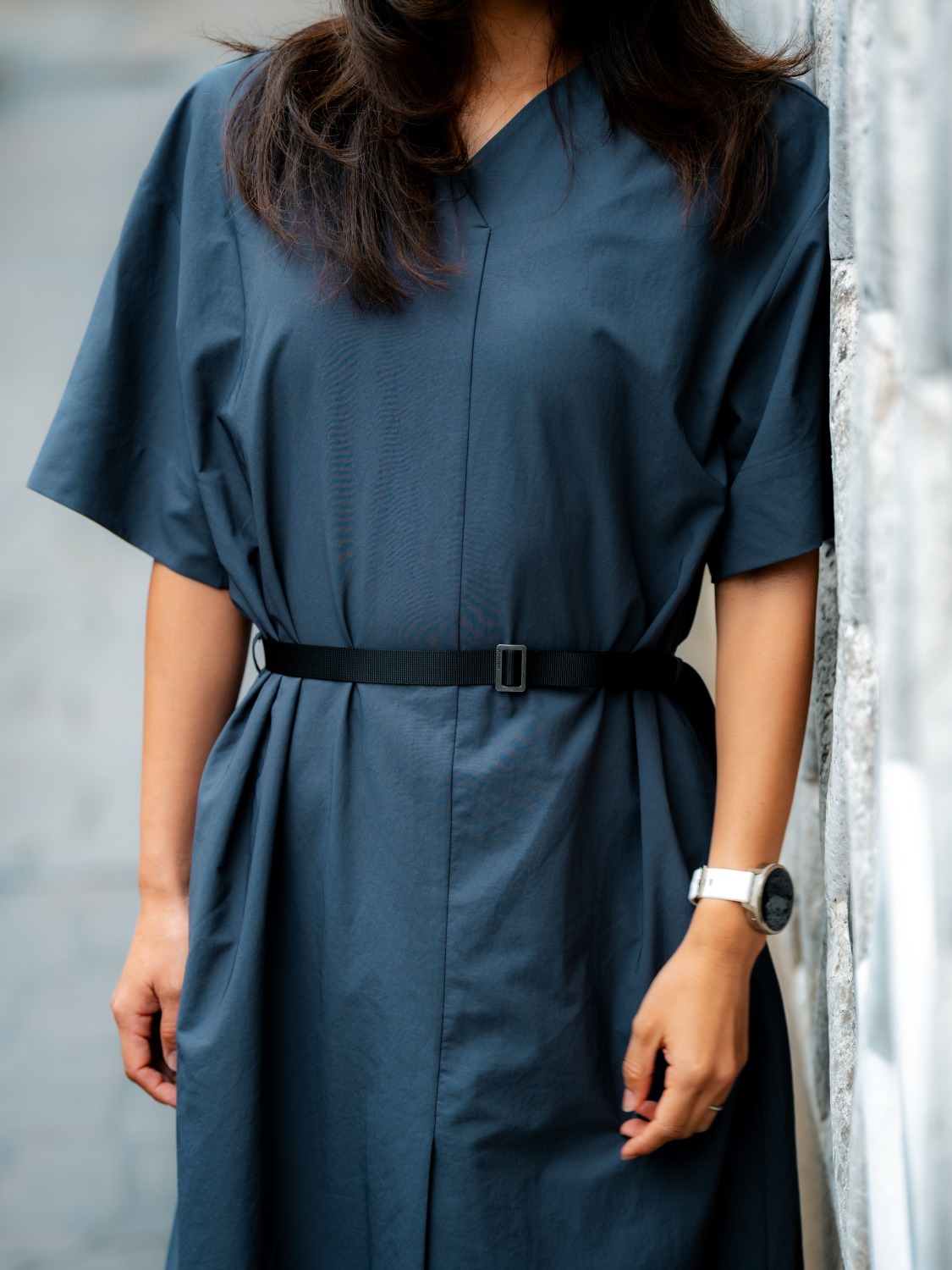 全体的にふんわりとしたシルエットながら、ベルトの使い方が着こなしのポイントのひとつ。