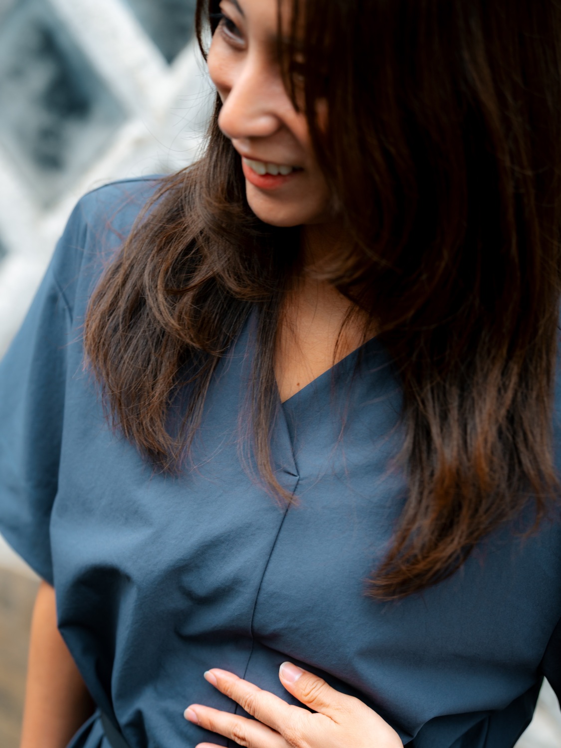 屋外での着替えなどでポンチョのようなにも使ったり、肌寒い時にさっと羽織ったりと多様な使い方もでき、それでいて不思議と違和感なく着こなせるドレスです。