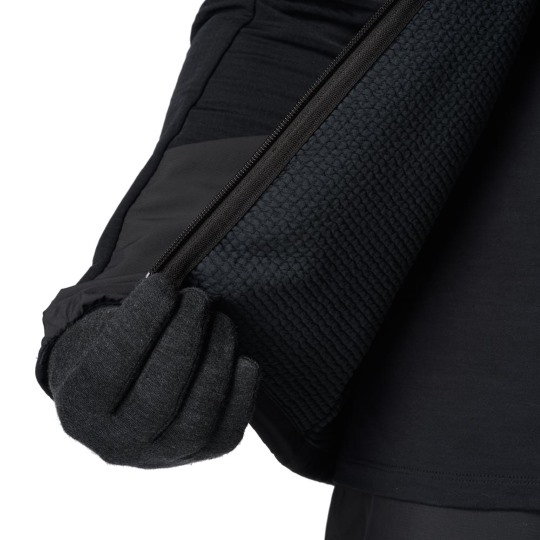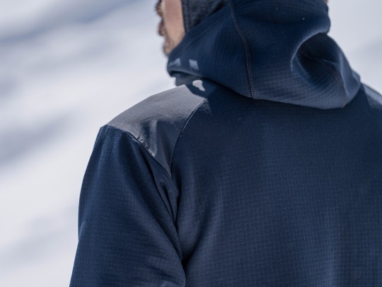 Polartec® Power Air™ Activeをベースにしつつ、ボディ前面と袖口内側の表地にウィンドシェル生地を貼り付けることで、防風や撥水といった耐候性、摩擦に対する耐久性が向上しました。