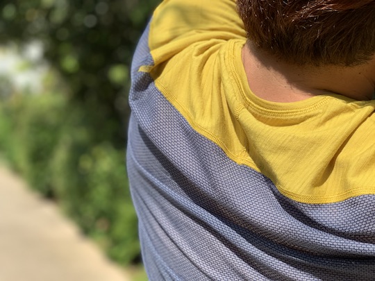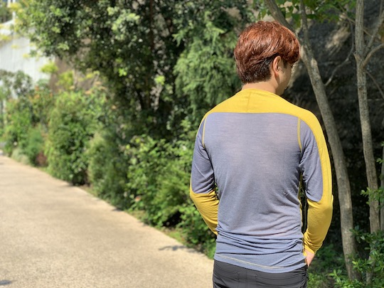 また、通気性や速乾性を最大限に高めるため背中や二の腕などグレーの部分は60% Merino Wool、40%Recycled Polyesterを使用。