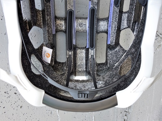 ヘルメット内部のちょうど真ん中あたりに白の矢印が見えると思うのですが、ダイヤルとも繋がっているコードを出し入れすることで、被り心地の深さを調整できるようになっています。