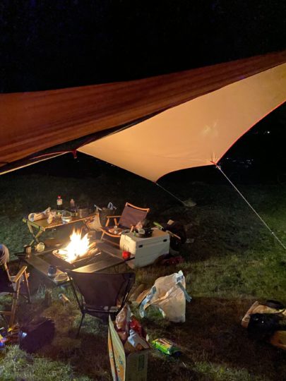 面倒くさがりな僕はテントは張らずにタープの下にエマージェンシーシートを敷いて、シュラフのみのごろ寝スタイル。朝方雨が降ってきたので敷いてたエマージェンシーシートを巻き付けて雨を防ぐ、さなぎスタイルに変化しながら睡眠。あまり快適ではないのでおススメは致しません。さらに他のキャンパーからは人が寝っ転がっているのでビックリしたでしょう笑