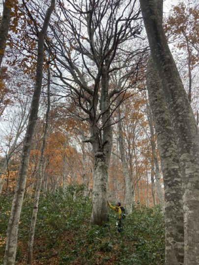 身長を余裕で超える藪漕ぎの末にたどり着いたブナの木天国。美しい。