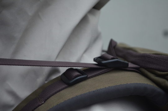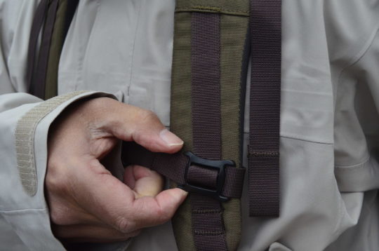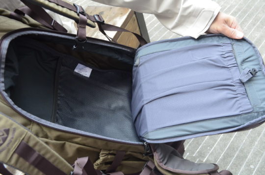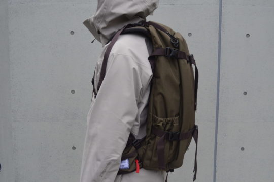 独自に企画開発を行った背面パッドは、背骨を中心にそのサイドを固定し安定させる構造で、たくさんの荷物を入れた状態では特にバック自体が球体になるのを背面パッドで平面に抑える事で背中へのフィット感を維持させます。