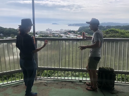 江ノ島を見ながら休憩。スポーツをした後に、自然を見ながらのトークは盛り上がります。
