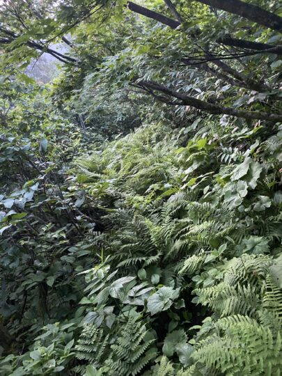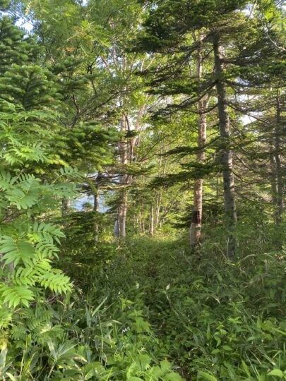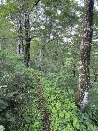 ブナの森をを楽しみながら進みます。ちなみに足元に生えている草の朝露で渡渉しているのかぐらいシューズはビチャビチャ。
