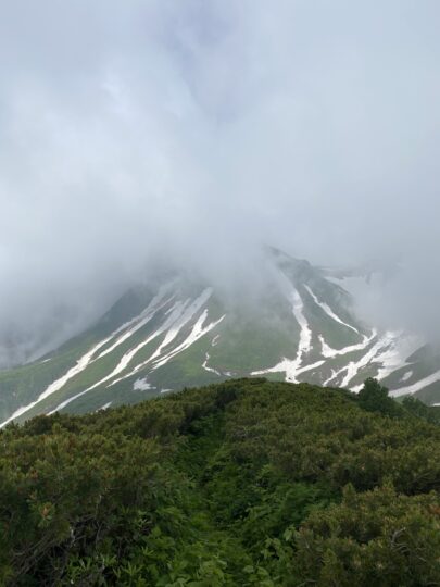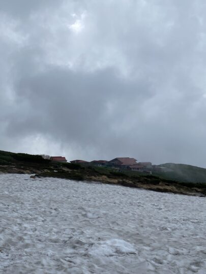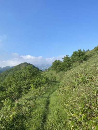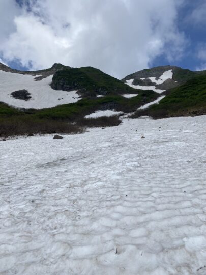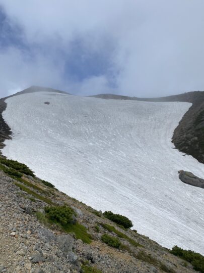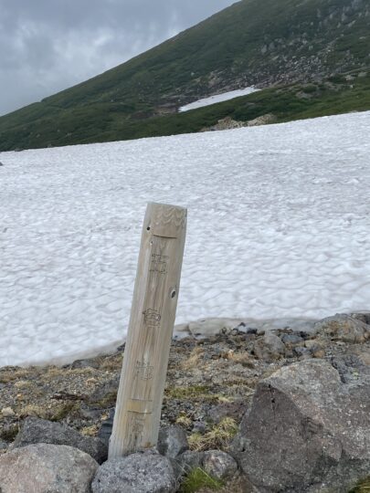 お花松原。この辺りから雪渓が残っていて所々で夏道が覆われていました。トレランシューズだと雪渓は結構滑ります。登りはマシですが下りは気を抜くとヤバそうなので、ルートを間違って登ってしまわないように確認しながら進みます。使わなかったですが軽アイゼンは持っていました。