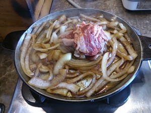 たまねぎが飴色になってきたら一気に肉の山を崩しにかかります。