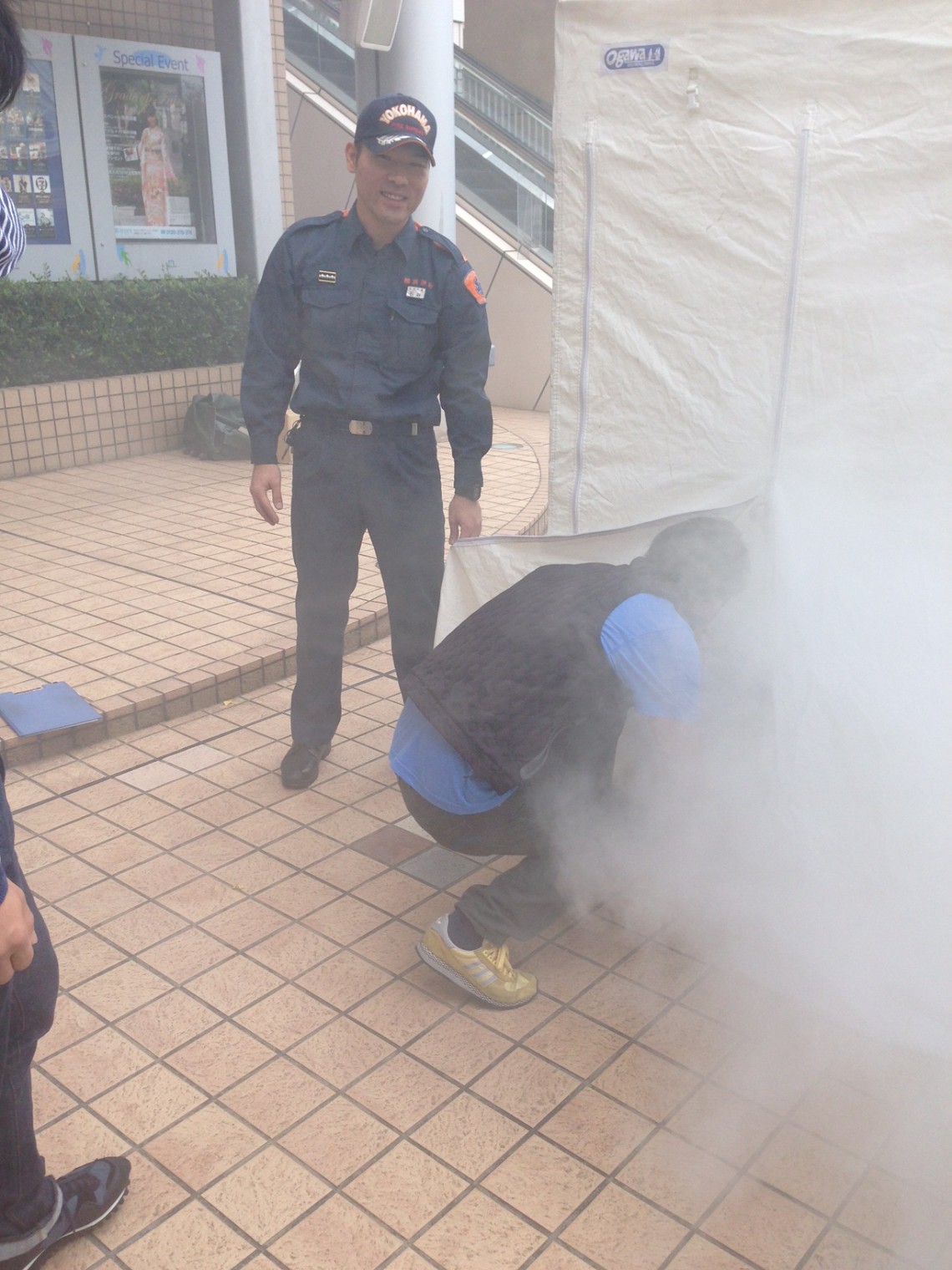 消防「えー、ハンカチをお持ちでない方は、袖をしっかり口に当ててください」